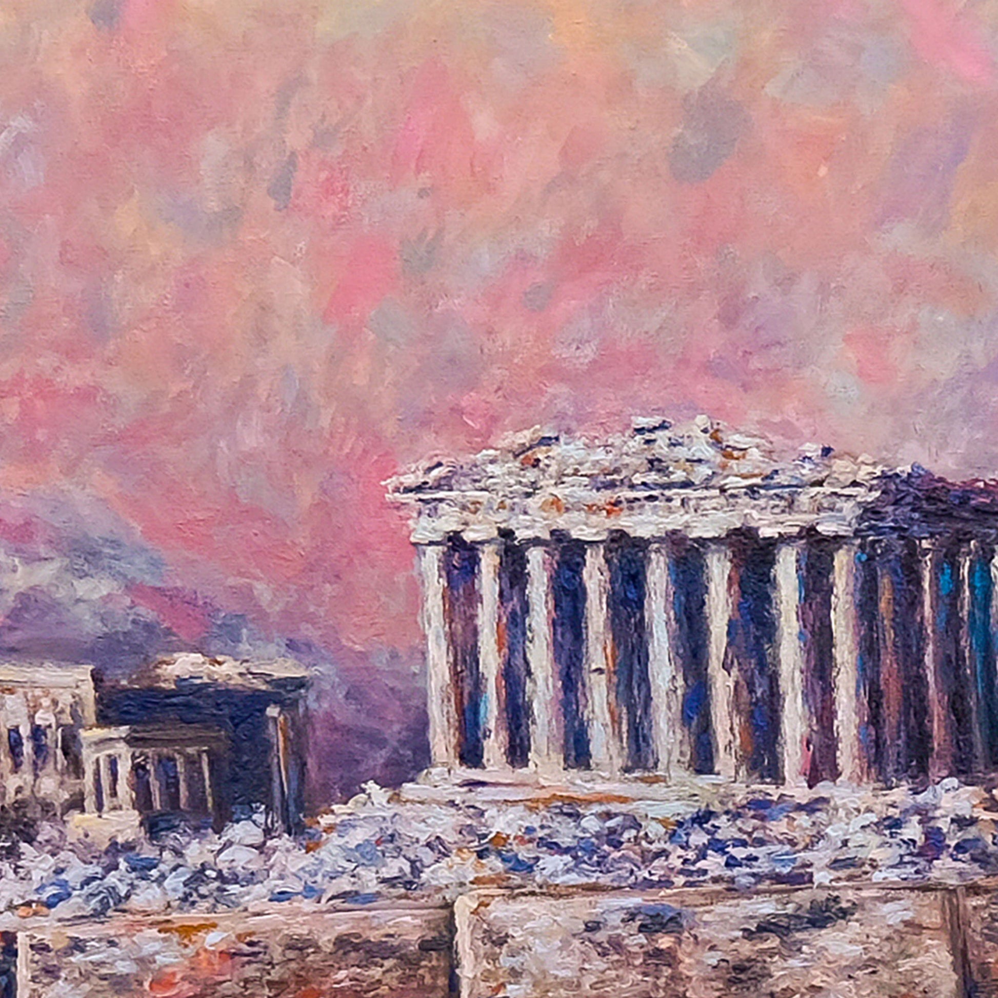 Η Ακρόπολη των Αθηνών είναι ένα μέρος που θα μπορούσα να επισκεφτώ ξανά και ξανά. Κάθε φορά είναι διαφορετική και φαίνεται απίστευτη σε κάθε είδους καιρικές συνθήκες. Είχα έναν τεράστιο καμβά και ένιωσα ότι αυτό το διαχρονικό θαύμα του κόσμου θα ήταν το τέλειο θέμα για αυτό.