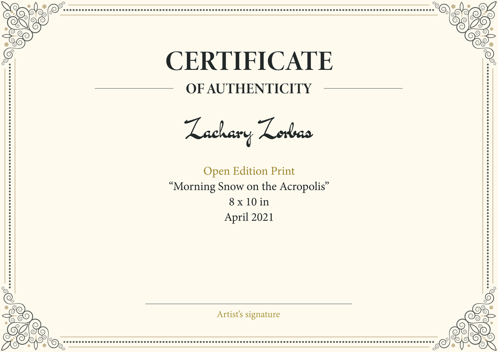 - Ανοιχτή εκτύπωση της πρωτότυπης ελαιογραφίας "Πρωινό χιόνι στην Ακρόπολη" του Ζαχαρία Ζορμπά
