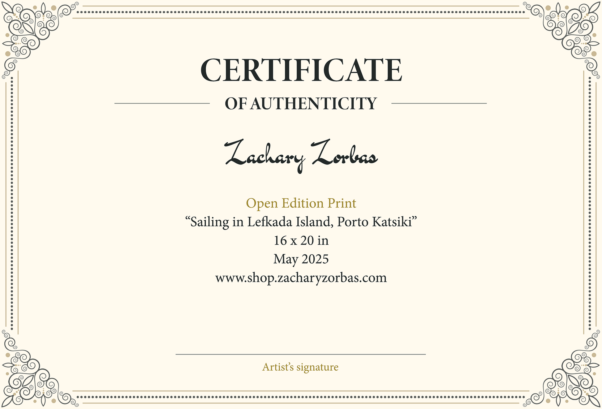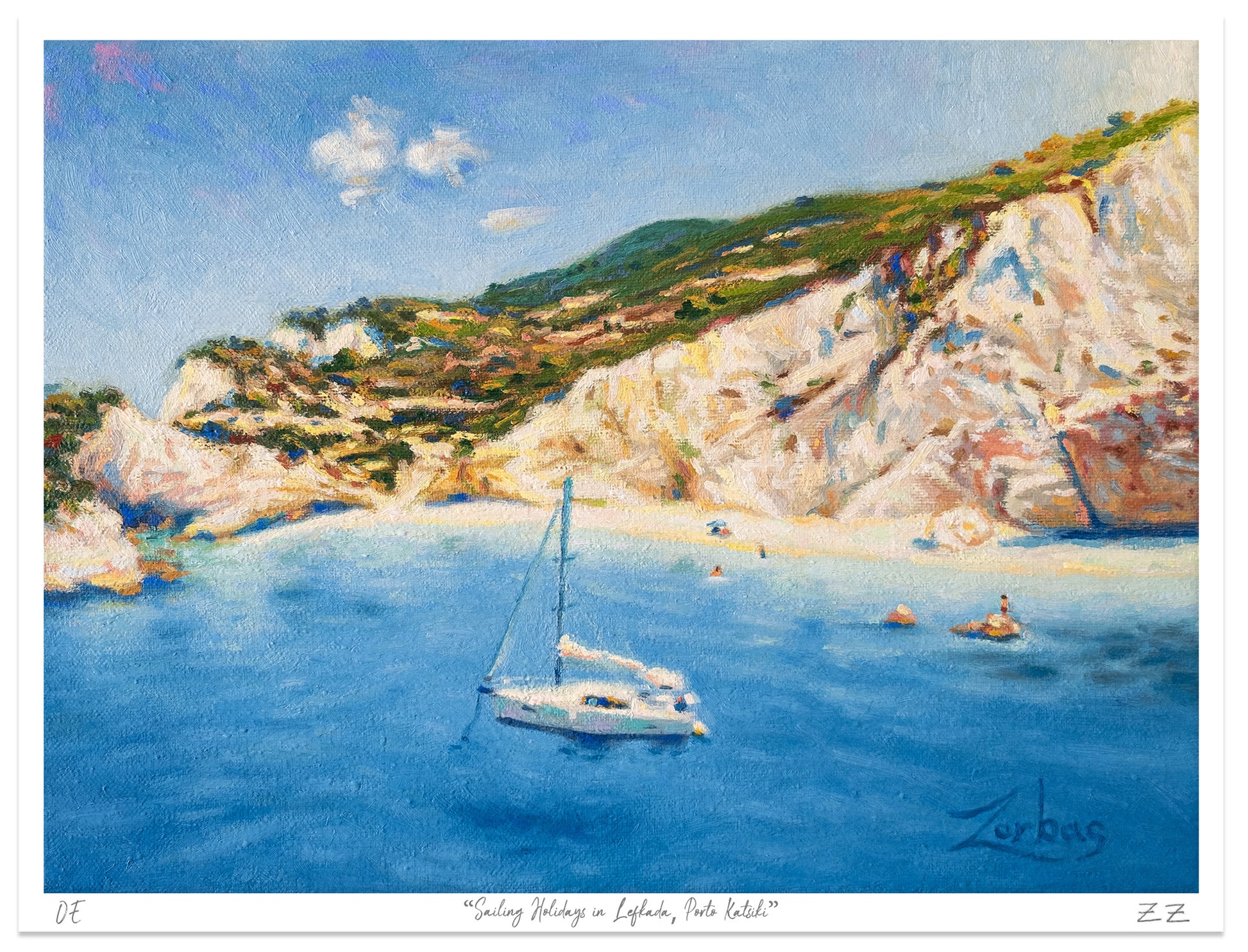 - Ανοιχτή εκτύπωση της πρωτότυπης ελαιογραφίας του Ζαχαρία Ζορμπά «Ιστιοπλοΐα στη Λευκάδα, Πόρτο Κατσίκι»
