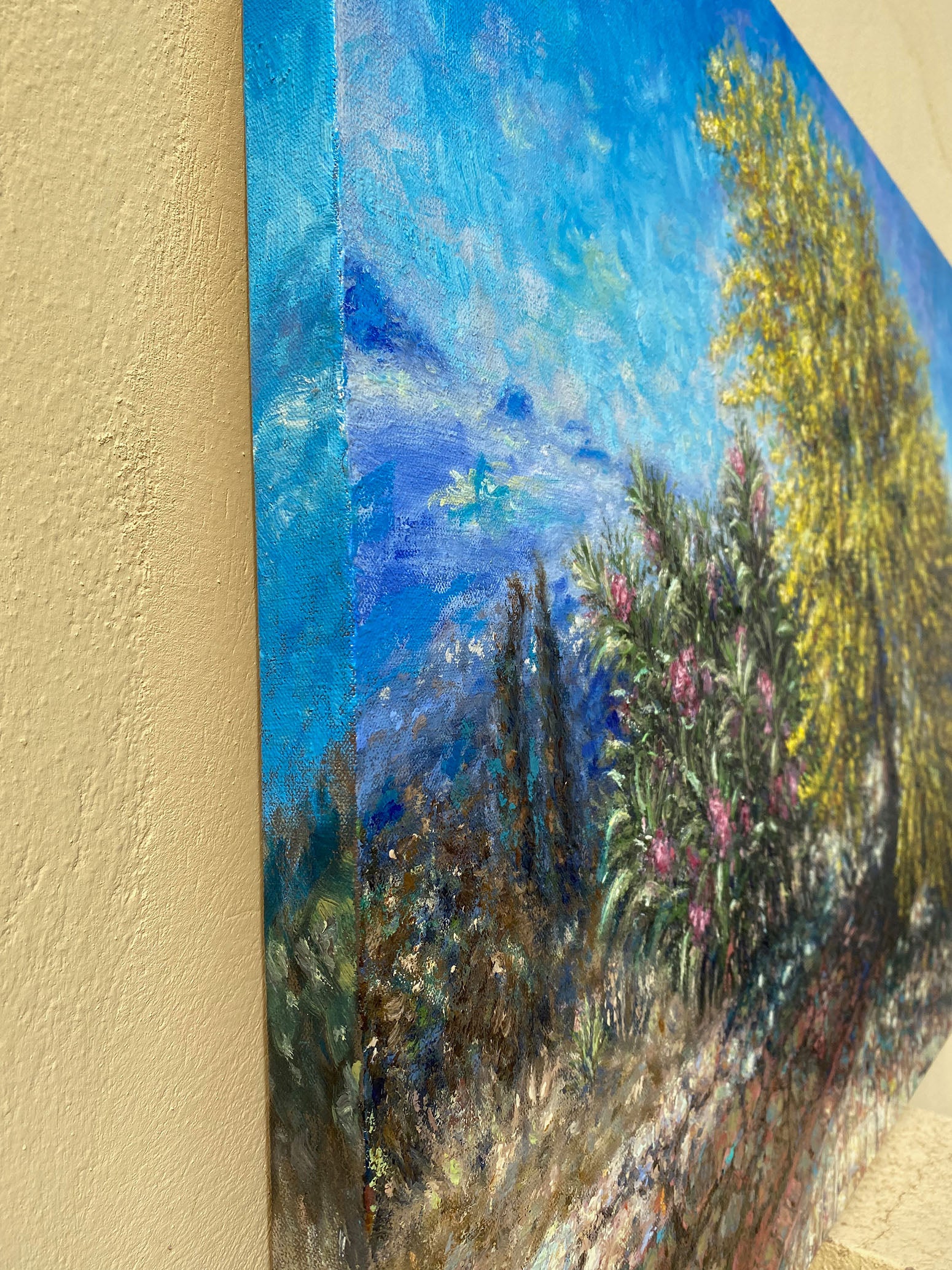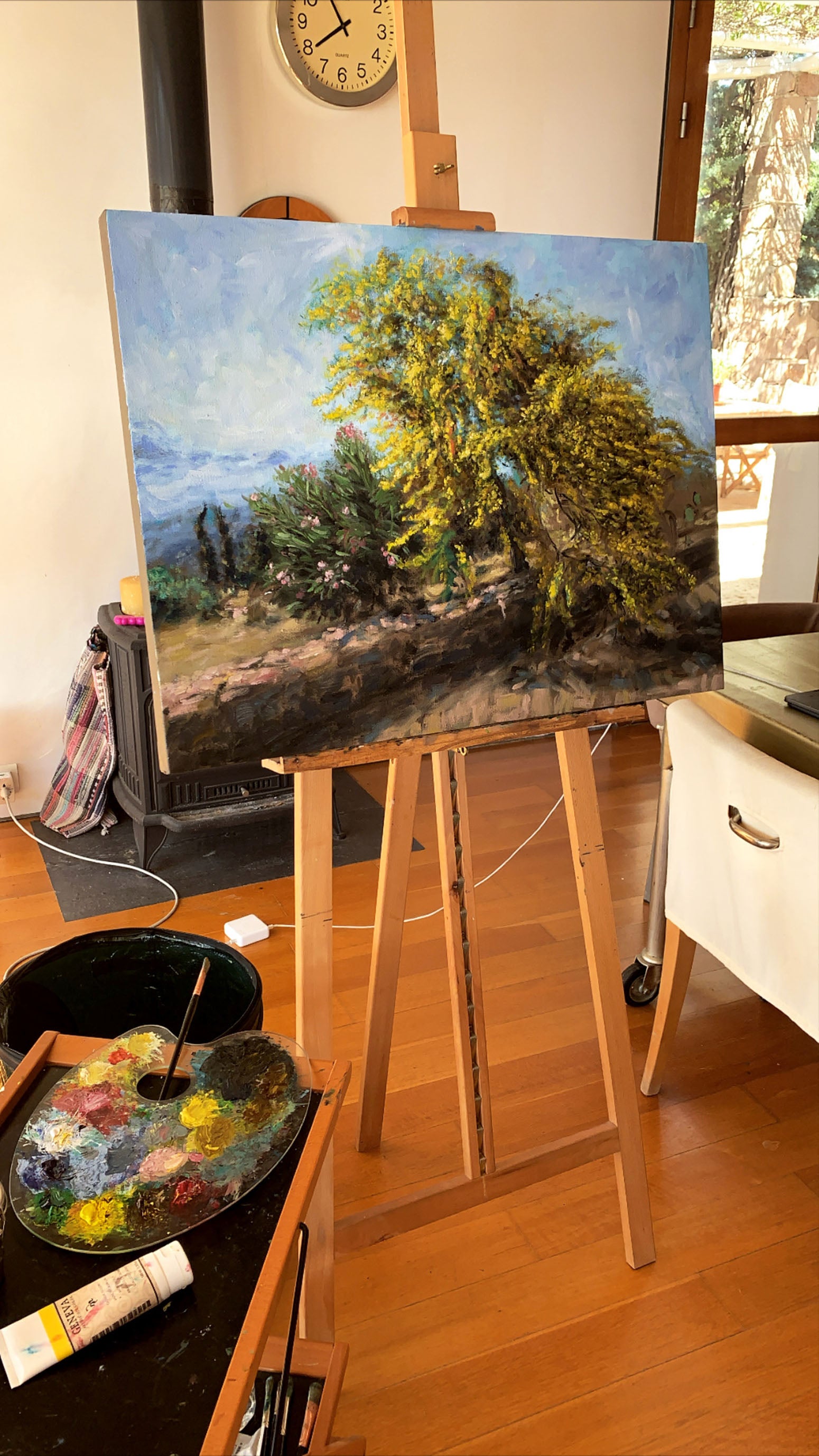 - Πρωτότυπος πίνακας του Ζαχαρία Ζορμπά με τίτλο "Ανθισμένη Ακακία στους Τζίκηδες της Αίγινας" χειροποίητος στην Αίγινα, Ελλάδα