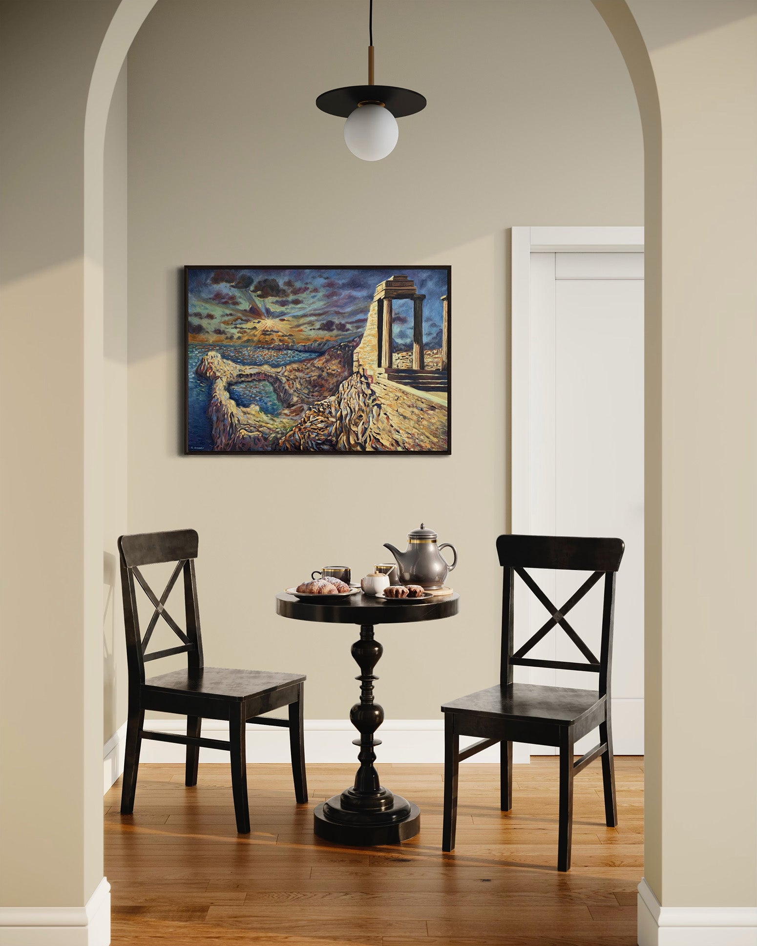 • Εικόνα τυπωμένη από εκτυπωτή inkjet σε καμβά της πρωτότυπης ελαιογραφίας «Ακρόπολη της Λίνδου, Ρόδος» του Ζαχαρία Ζορμπά