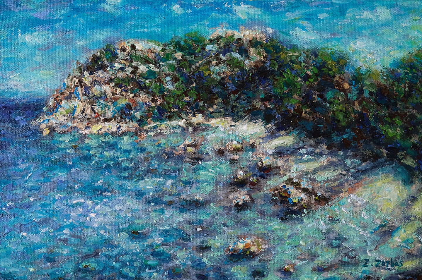 - Εικόνα τυπωμένη από εκτυπωτή inkjet σε καμβά της πρωτότυπης ελαιογραφίας του Ζάκαρι Ζορμπά "Anthony Quinn Bay, Rhodes"