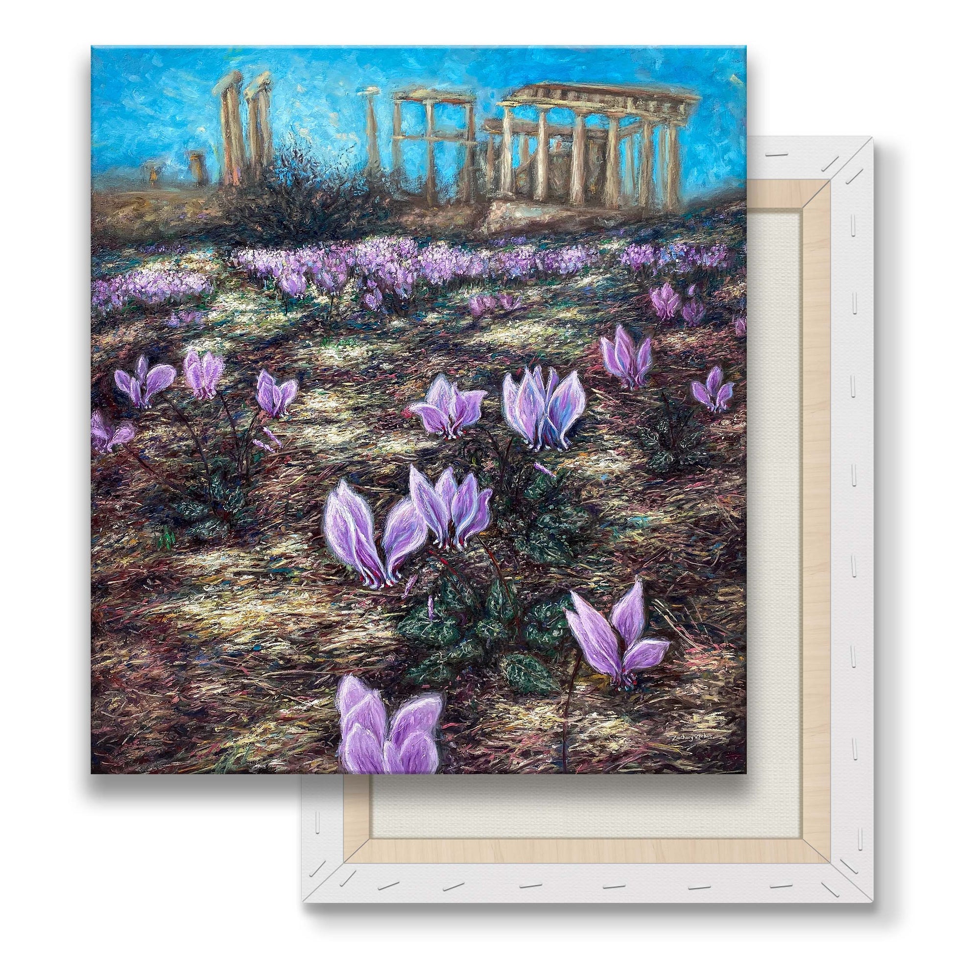 - Εικόνα τυπωμένη από εκτυπωτή inkjet σε καμβά της πρωτότυπης ελαιογραφίας "Κυκλάμινα λουλούδια στον ναό της Αφαίας" του Ζαχαρία Ζορμπά
