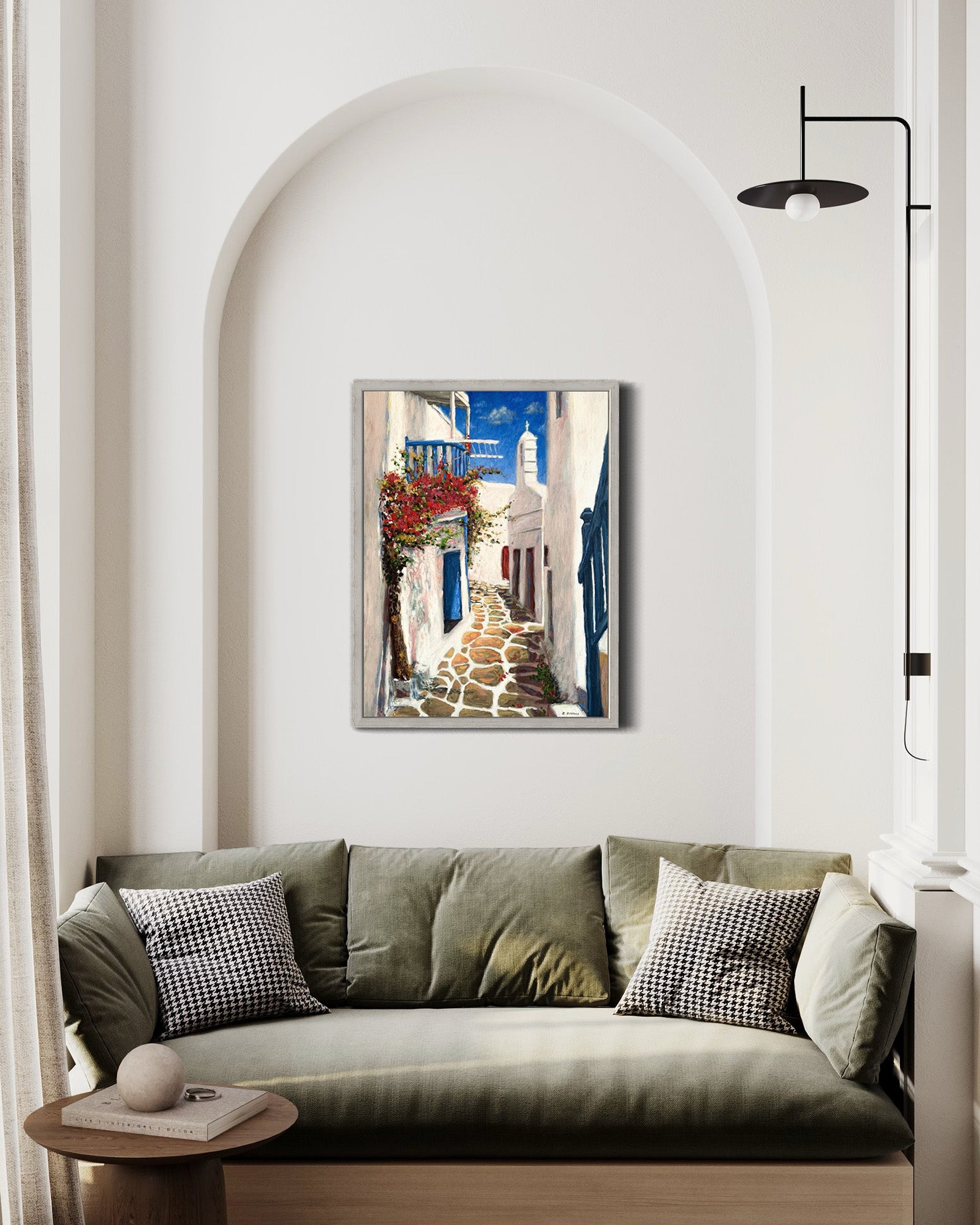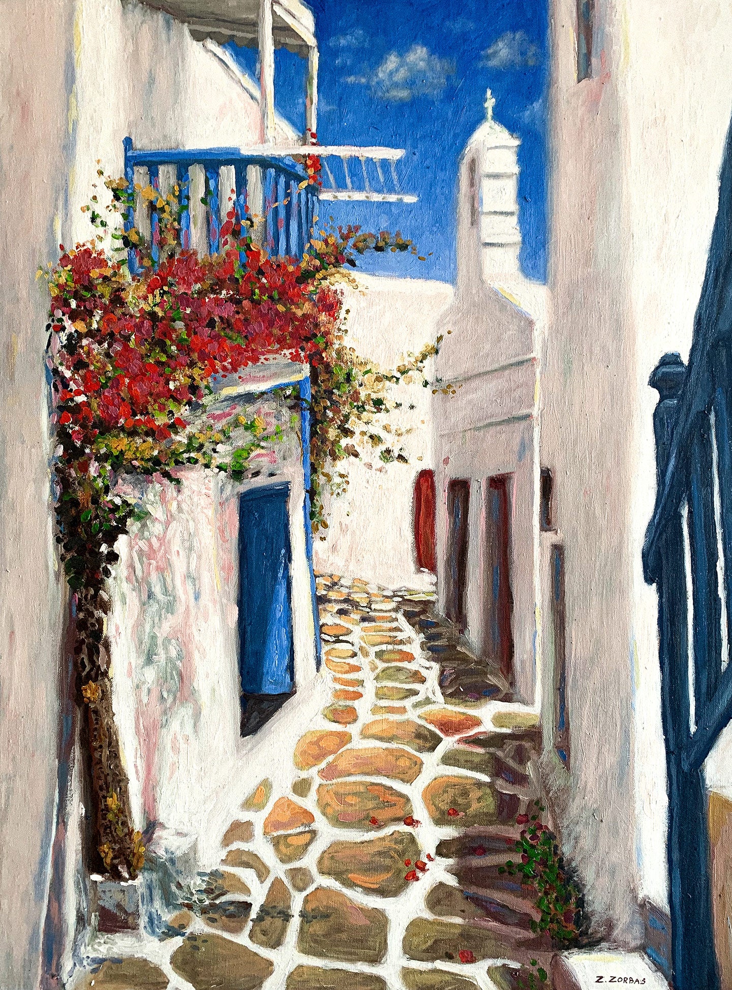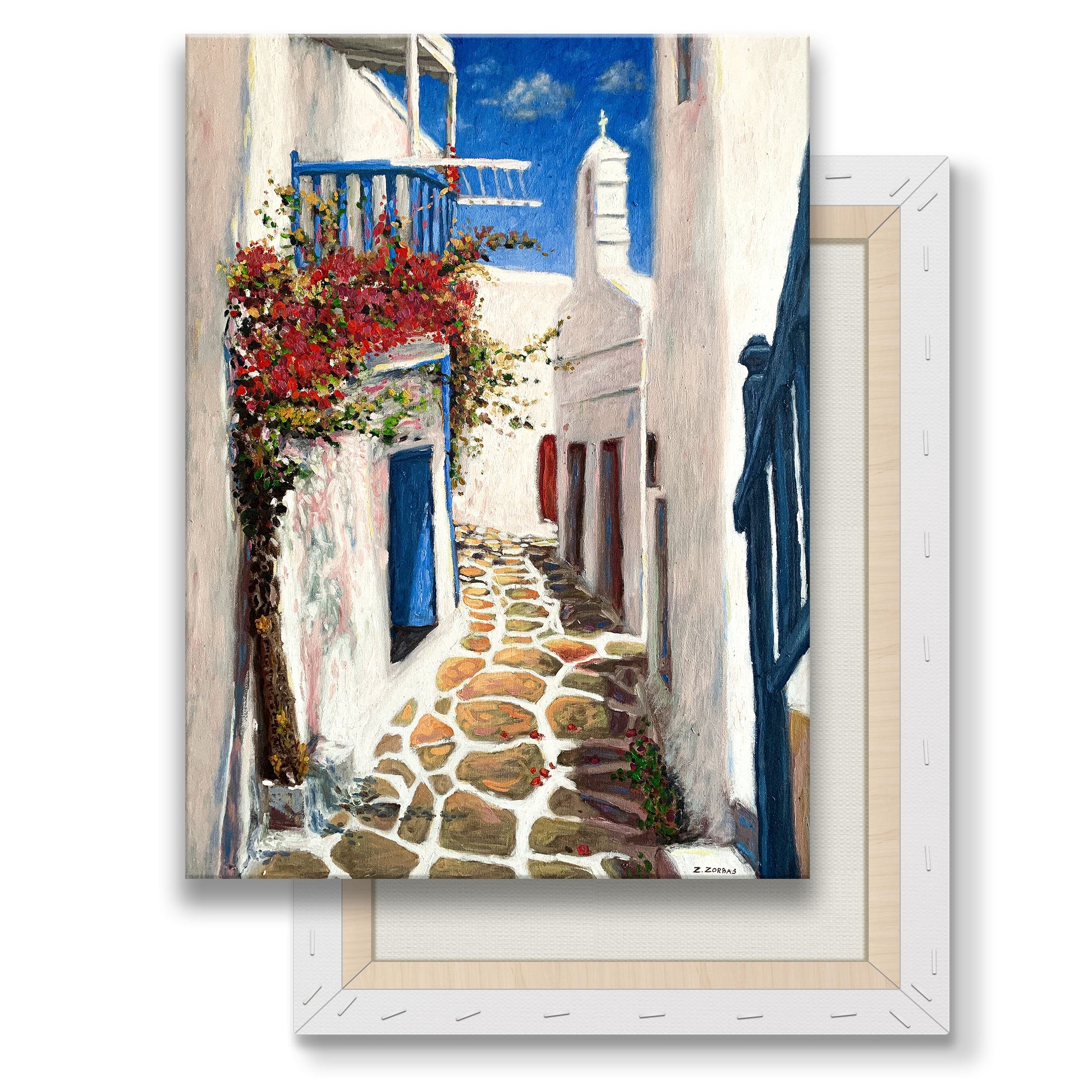 - Εικόνα τυπωμένη από εκτυπωτή inkjet σε καμβά της πρωτότυπης ελαιογραφίας "Η πόλη της Μυκόνου" του Ζαχαρία Ζορμπά