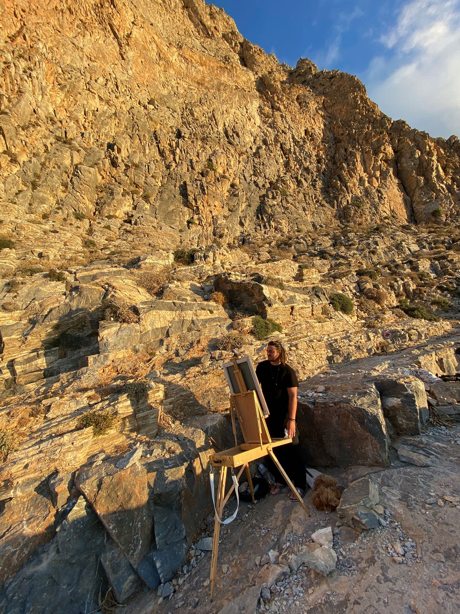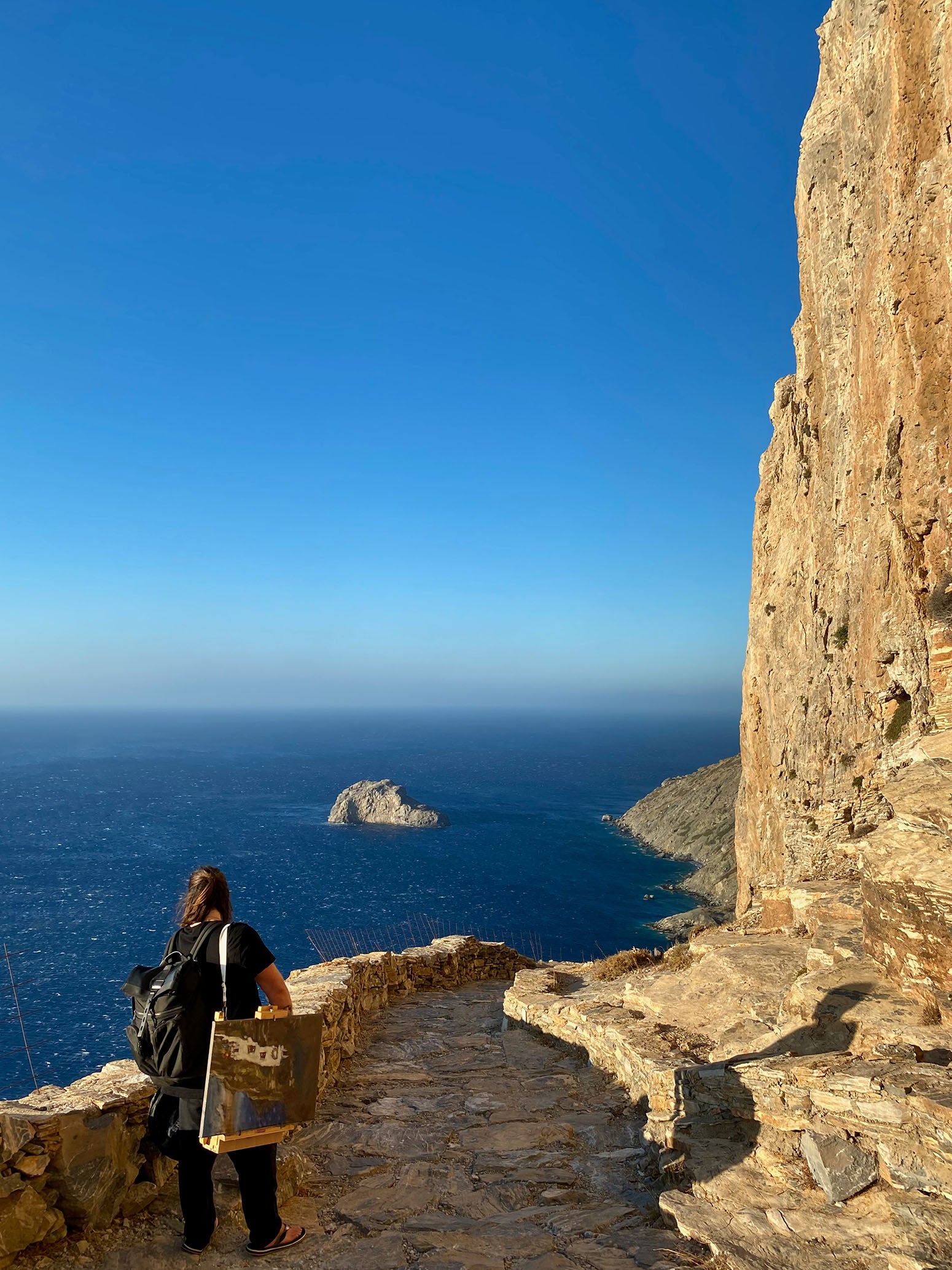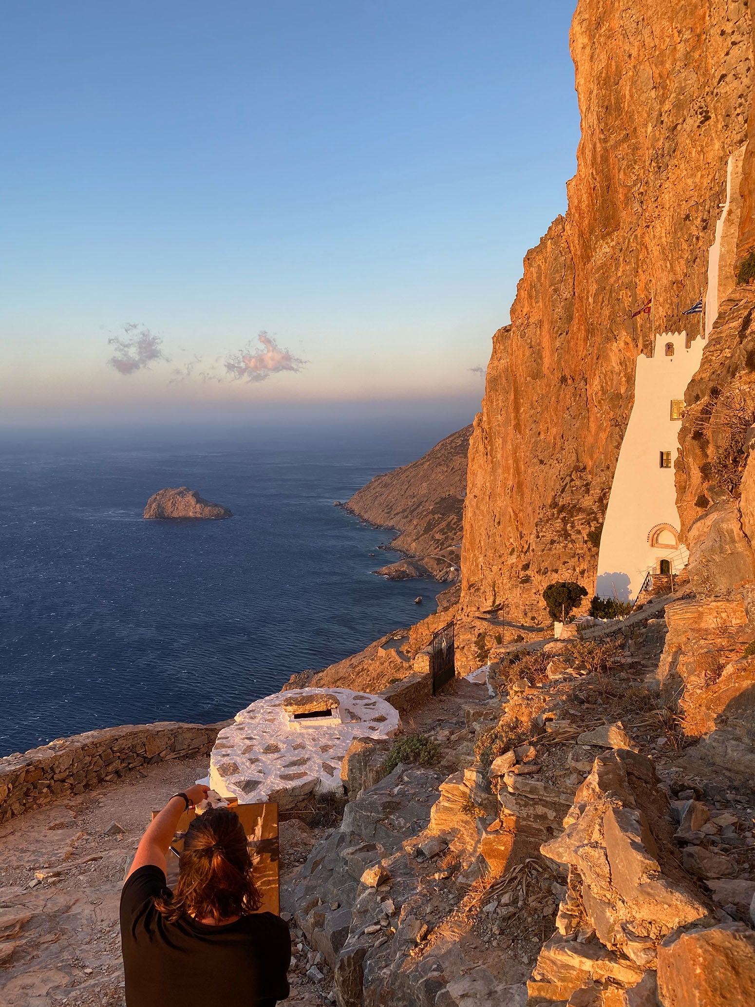 Μείναμε στην Αμοργό για μια εβδομάδα. Ένα πρωί στις 5 π.μ., ξυπνήσαμε και πήγαμε να ζωγραφίσουμε στο μοναστήρι. Ήταν δύσκολο να περπατήσουμε μέχρι εκεί, κουβαλώντας τόσα πολλά πράγματα στο σκοτάδι, με αέρα σε βραχώδεις βράχους. Υπήρξε μια στιγμή καθώς ο ήλιος ανέτειλε πίσω μας, όταν το φως χτύπησε το κύριο παράθυρο και αντανακλάστηκε προς τα έξω.