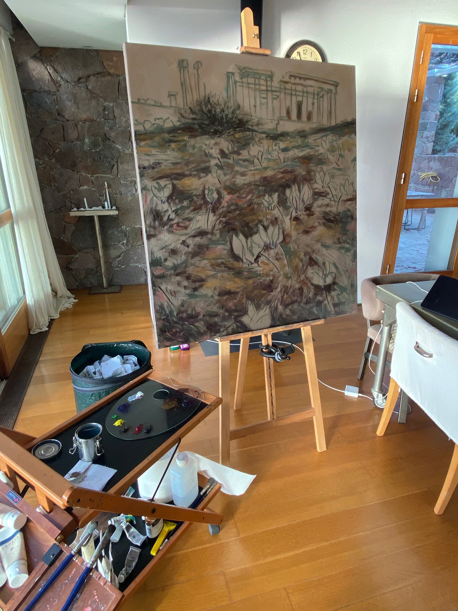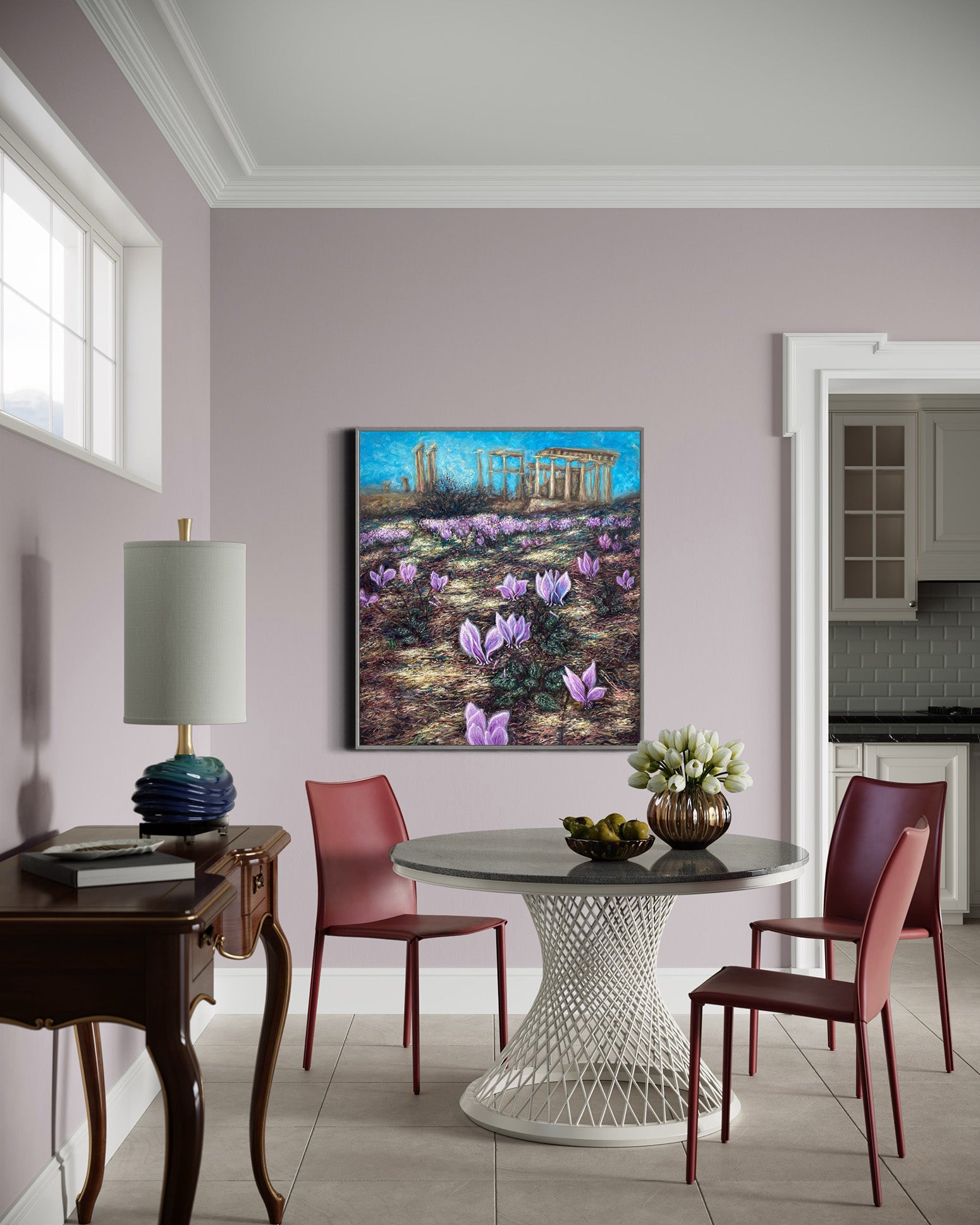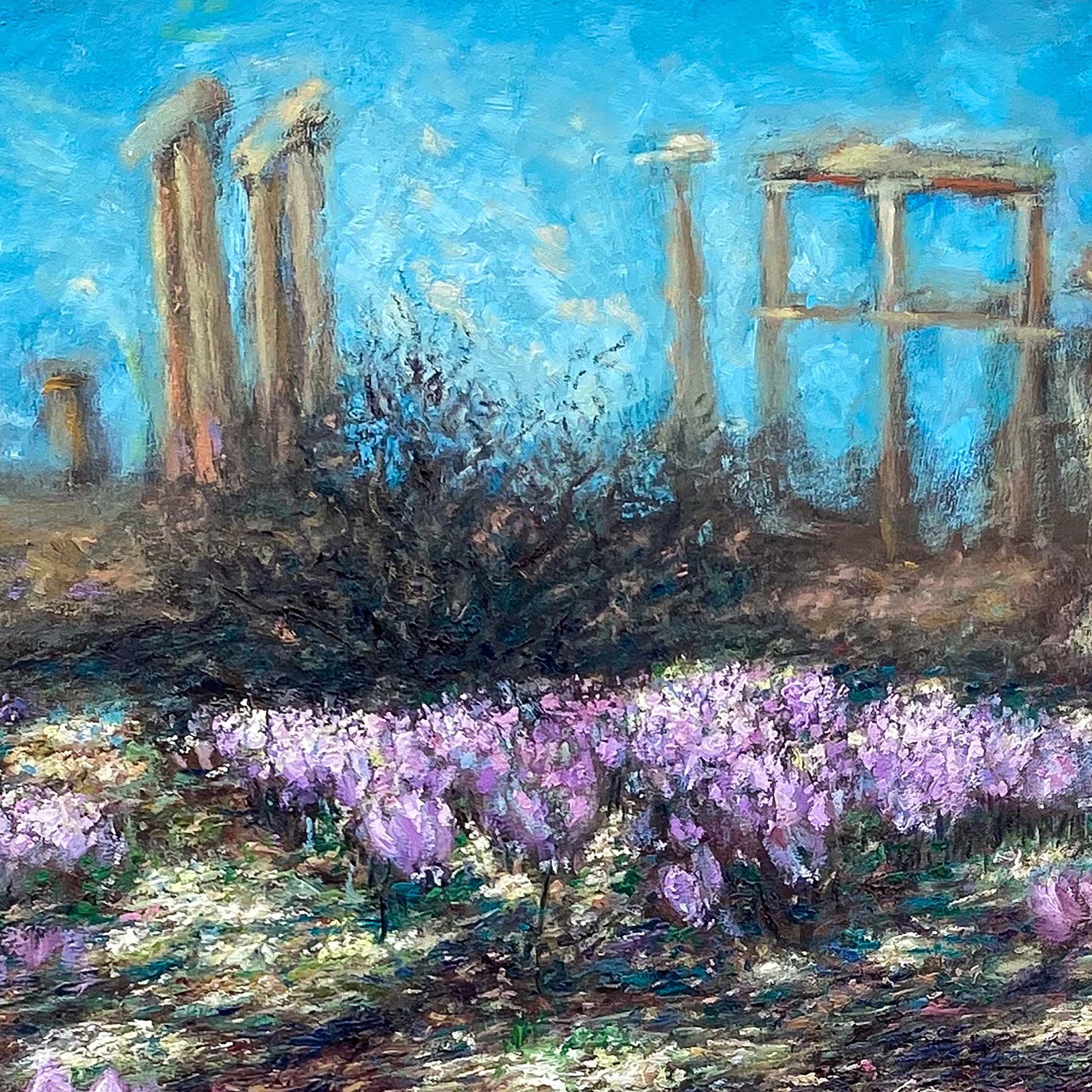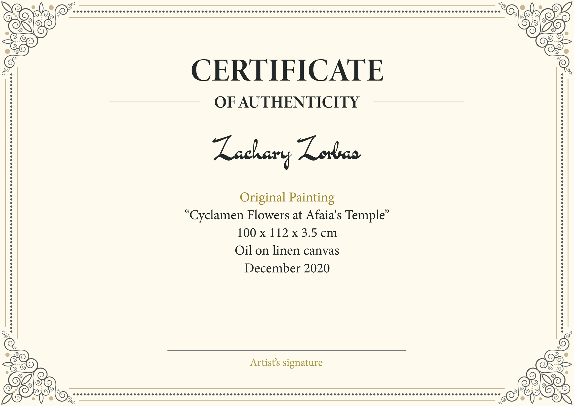 • Πρωτότυπος πίνακας του Ζαχαρία Ζορμπά με τίτλο «Άνθη Κυκλάμινων στον Ναό της Αφαίας» χειροποίητος στην Αίγινα