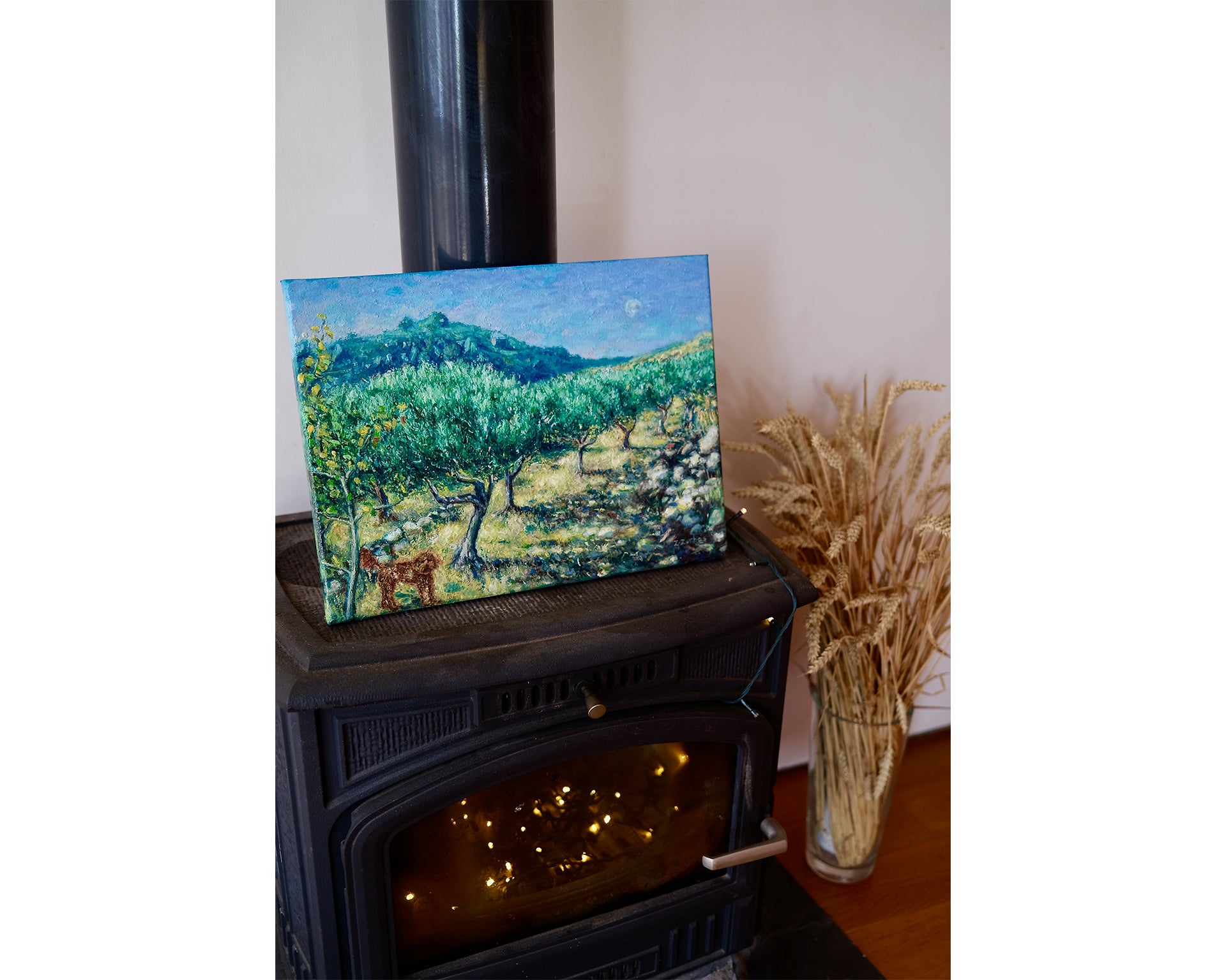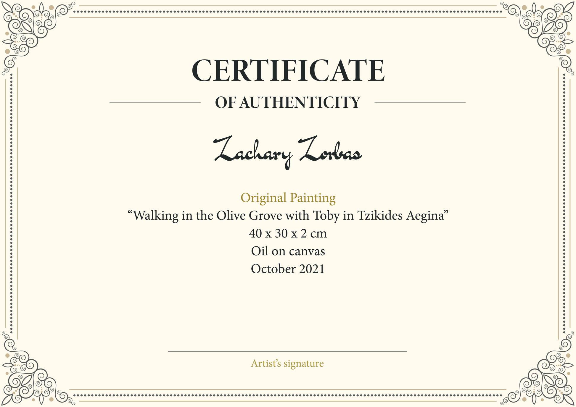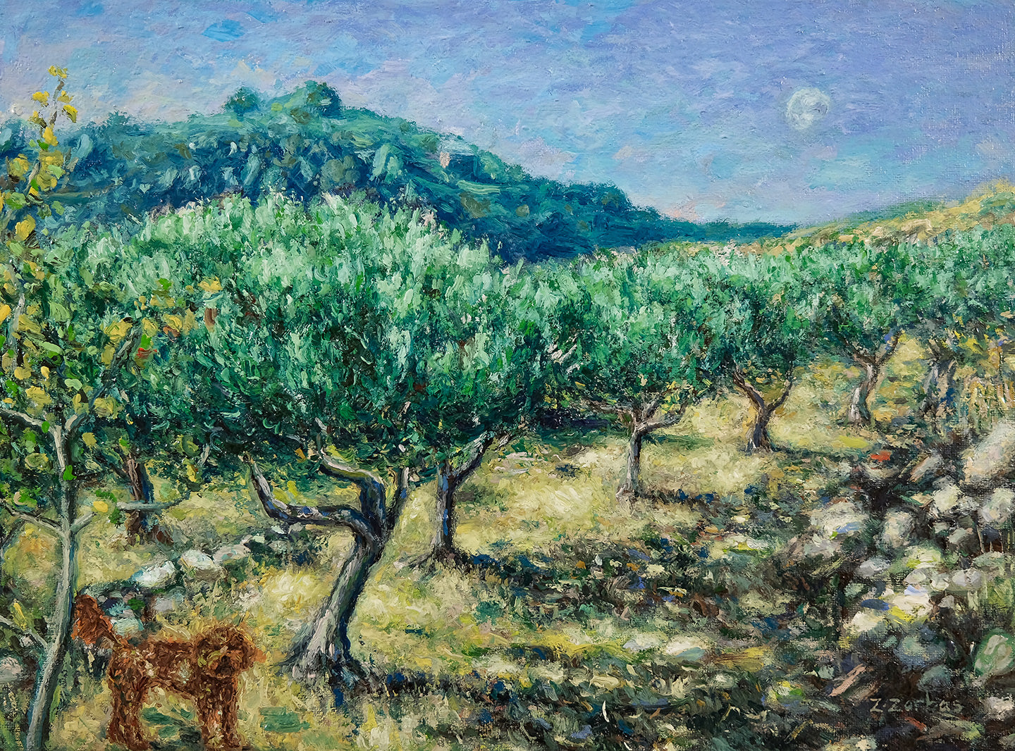 Πρωτότυπος Πίνακας: Περπατώντας στον Ελαιώνα με τον Τόμπι στους Τζίκηδες της Αίγινας