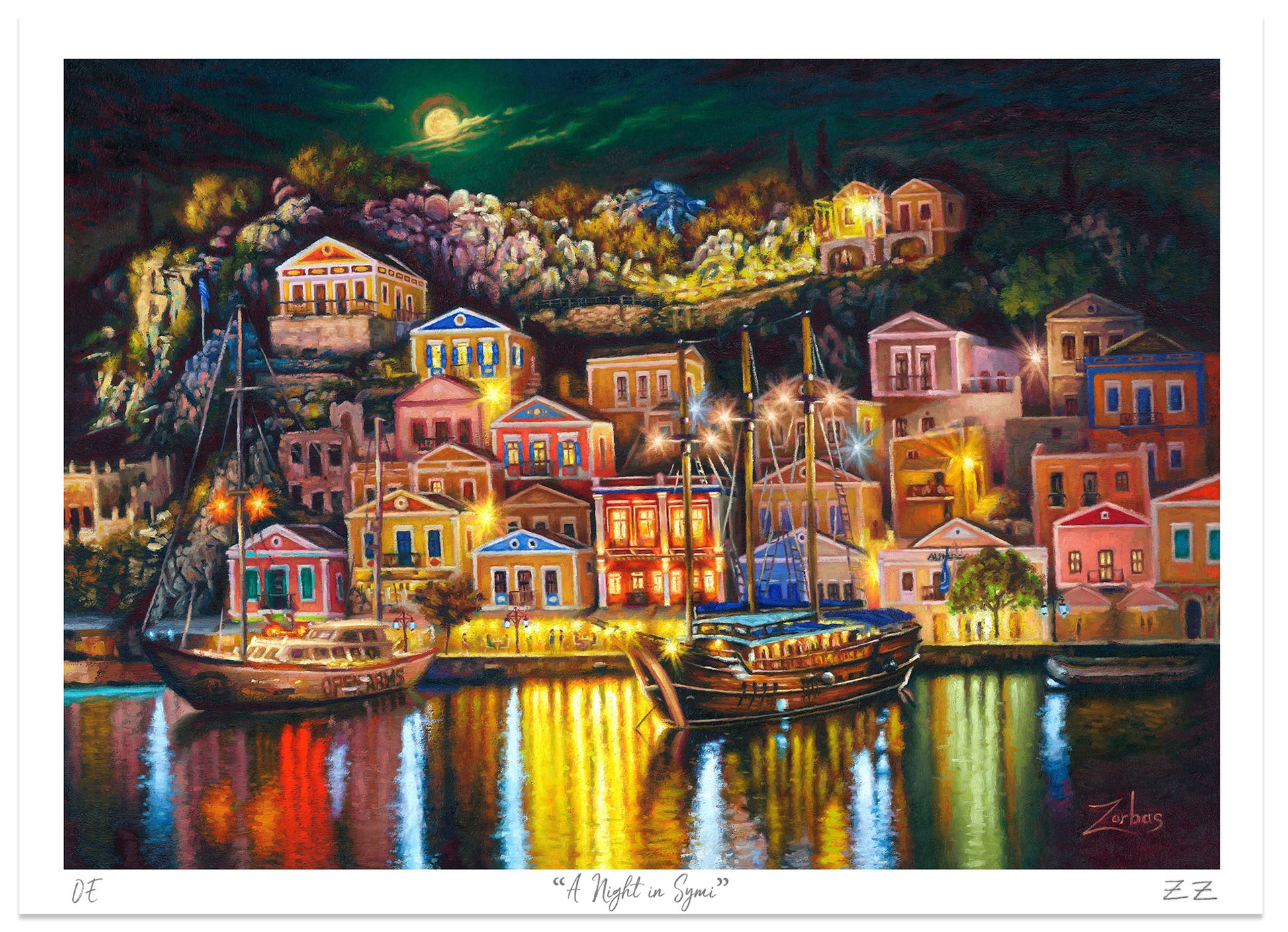 - Ανοιχτή εκτύπωση της πρωτότυπης ελαιογραφίας «Μια νύχτα στη Σύμη» του Ζαχαρία Ζορμπά