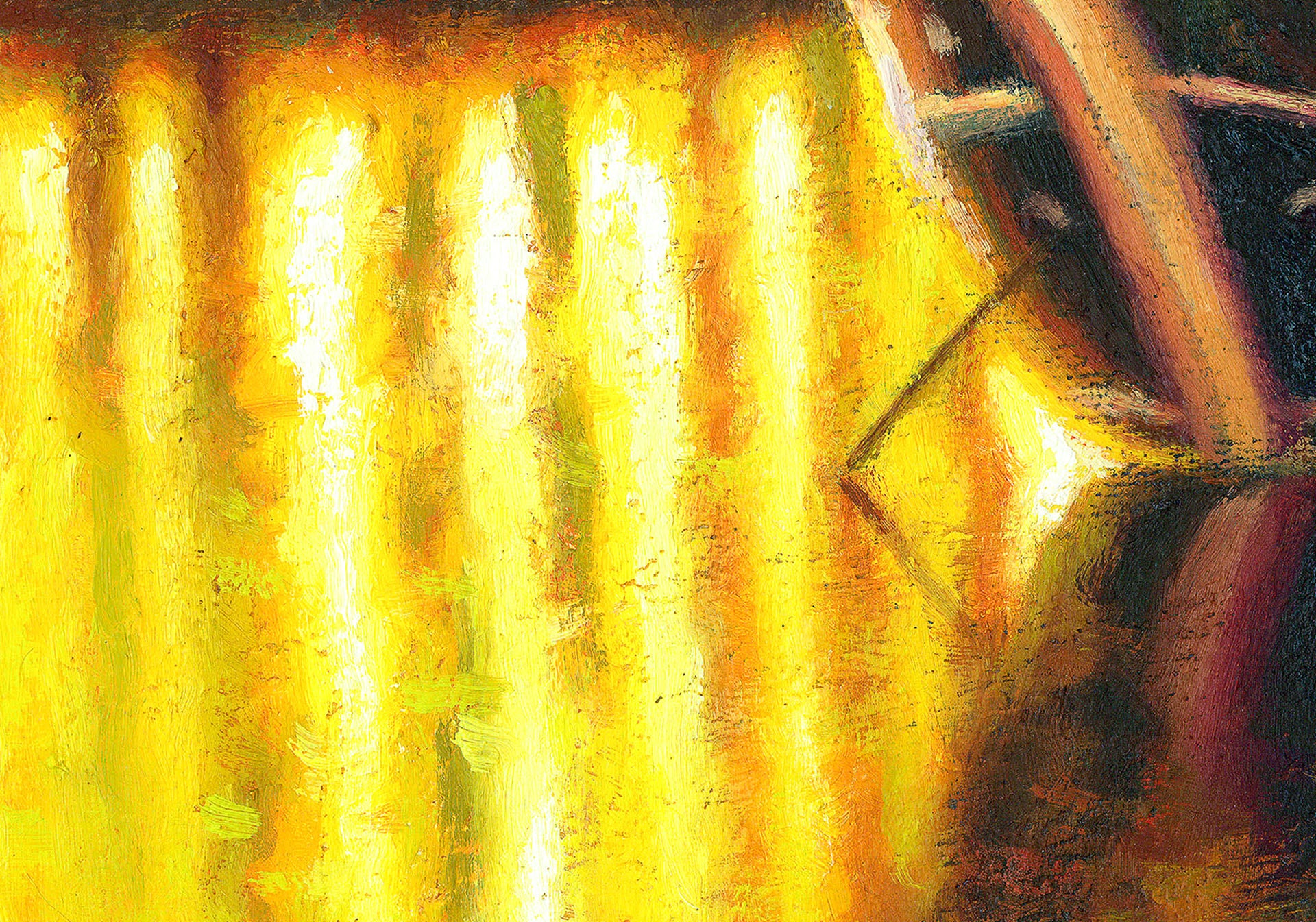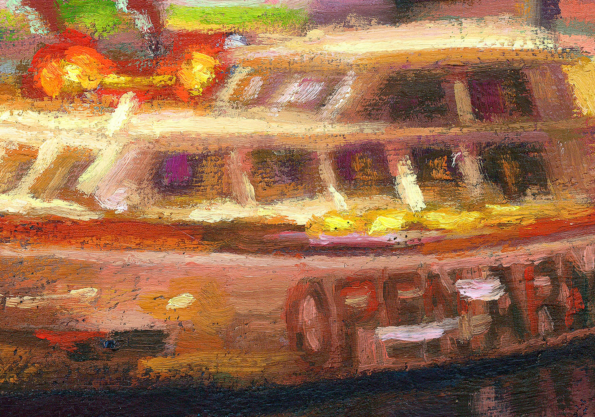 Σε όλο τον καμβά, έχουμε την ενέργεια της νυχτερινής ζωής. Άνθρωποι δειπνούν έξω, περπατούν εδώ κι εκεί, συζητούν κάτω από την πανσέληνο. Υπάρχουν τόσες πολλές φωτεινές αντανακλάσεις στην ήρεμη θάλασσα. Ζεστοί τόνοι κίτρινου, ροζ, πορτοκαλί και χρυσού. Μια έντονη αντίθεση με το δροσερό σκοτεινό φόντο των πλαγιών του Γιαλού. Έχουν χρησιμοποιηθεί σχεδόν όλα τα χρώματα του φάσματος. Έχω ενσωματώσει χαλαρές πινελιές και αμέτρητες στρώσεις παχύρρευστου χρώματος. Αυτό επιτρέπει στο φως να εισέλθει στην μεμβράνη του χρώματος και να φωτίσει την εικόνα.