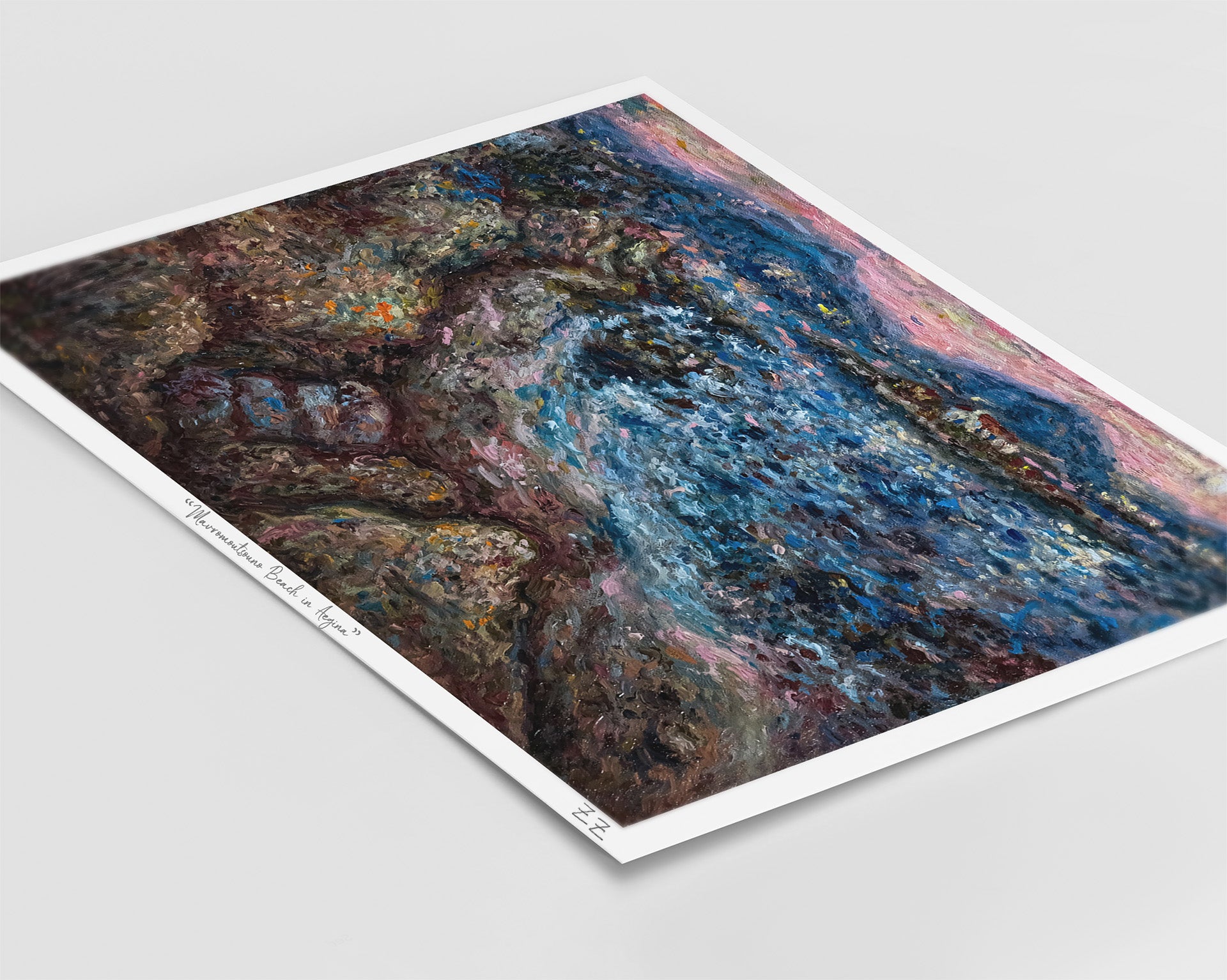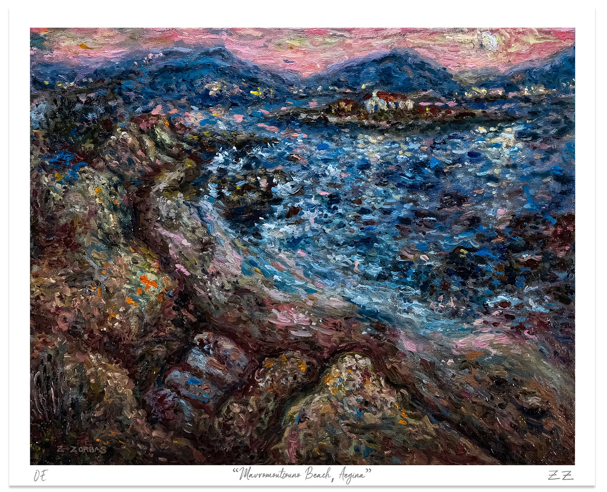 • Ανοιχτή εκτύπωση της πρωτότυπης ελαιογραφίας του Ζαχαρία Ζορμπά «Παραλία με Νησάκι στη Βαγία της Αίγινας»