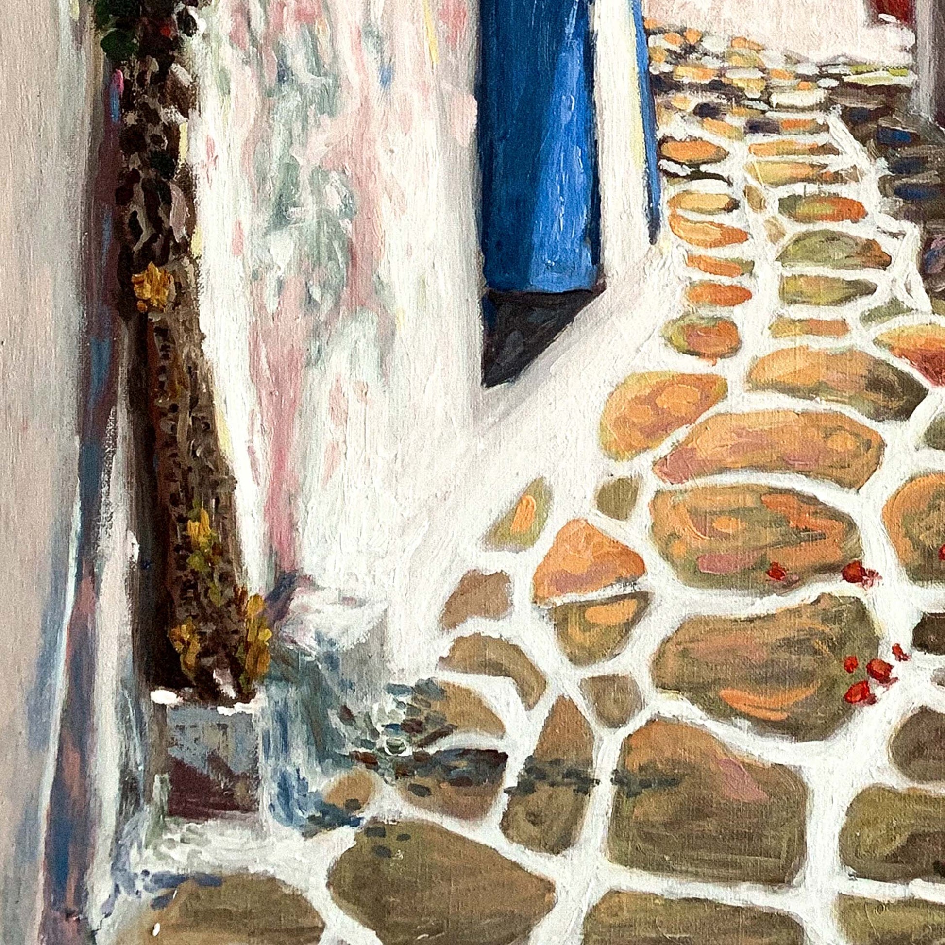 Την επόμενη μέρα εξερευνήσαμε την πόλη της Μυκόνου. Υπήρχαν παρθένα, ασβεστωμένα, κυβικά σπίτια με ξύλινες πόρτες και παράθυρα σε χρώμα ξύλου. Οι δρόμοι ήταν στενοί σχηματίζοντας έναν λαβύρινθο. Θυμάμαι τις ροζ-κόκκινες βουκαμβίλιες να κάνουν αντίθεση με τους φωτεινούς λευκούς τοίχους. Μπορούσες να δεις τη θάλασσα με τα κύματα να σκάνε στο τσιμέντο και μέσα από μικροσκοπικά σοκάκια.