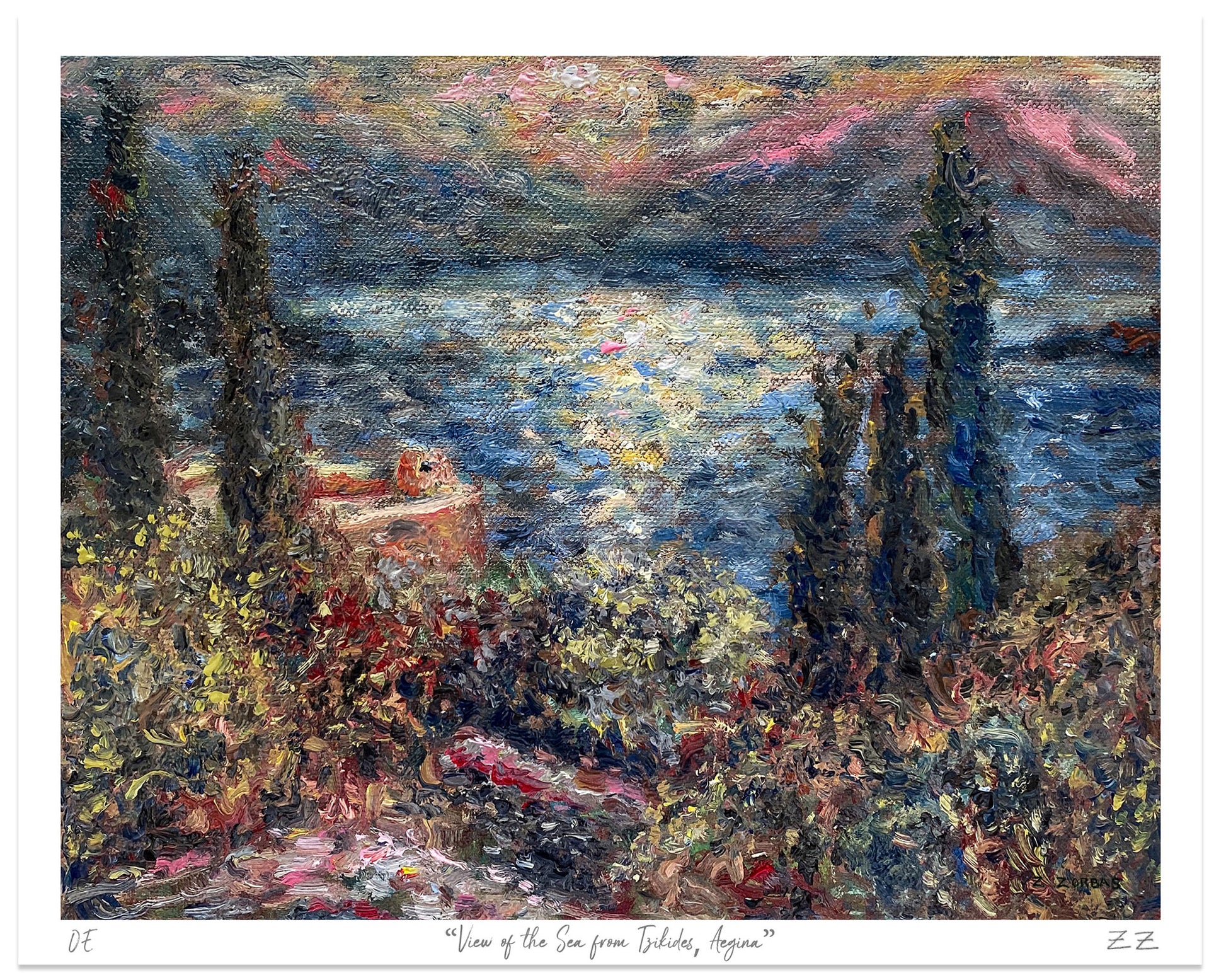 - Ανοιχτή εκτύπωση της πρωτότυπης ελαιογραφίας του Ζαχαρία Ζορμπά «Θέα στη θάλασσα από το σπίτι στους Τζίκηδες της Αίγινας»