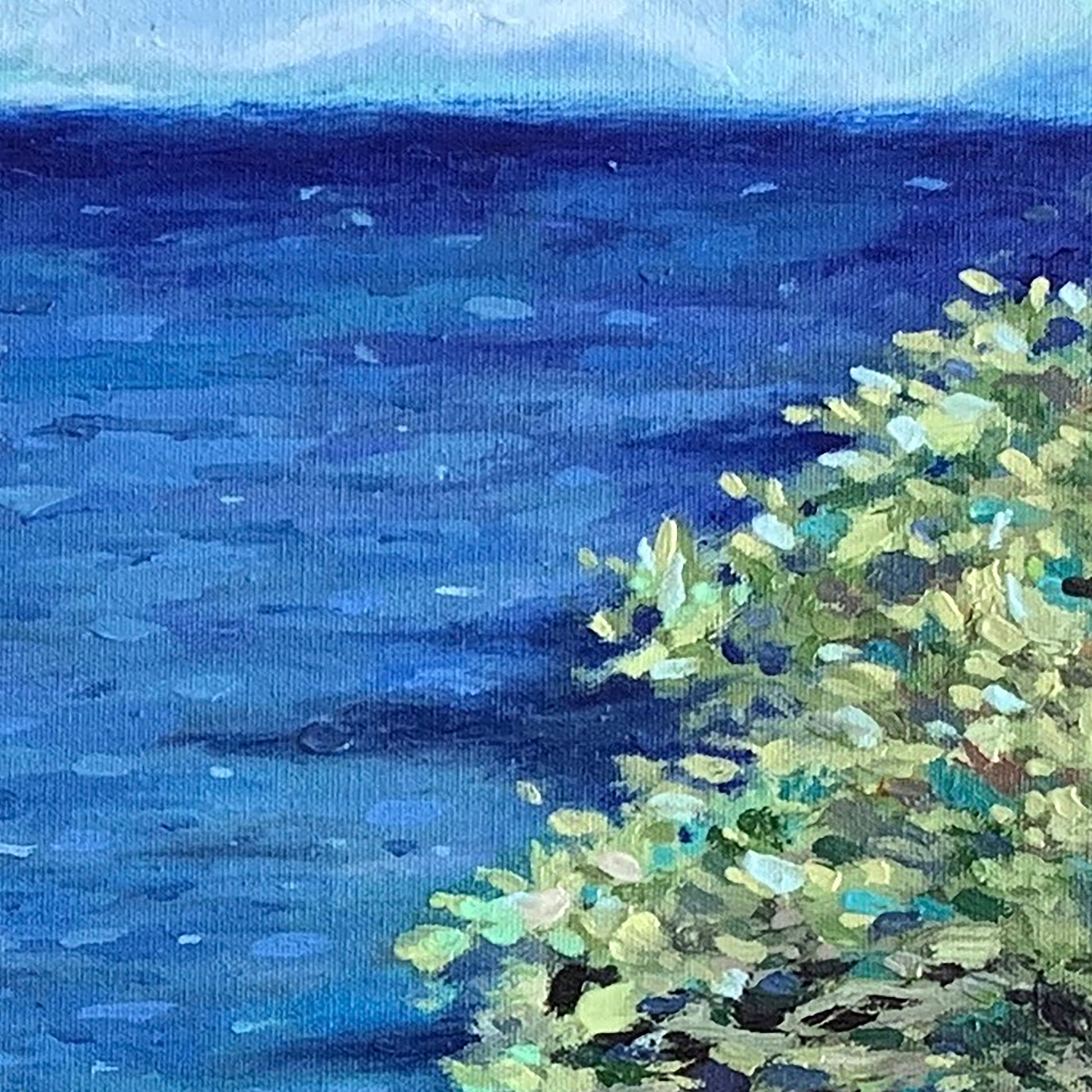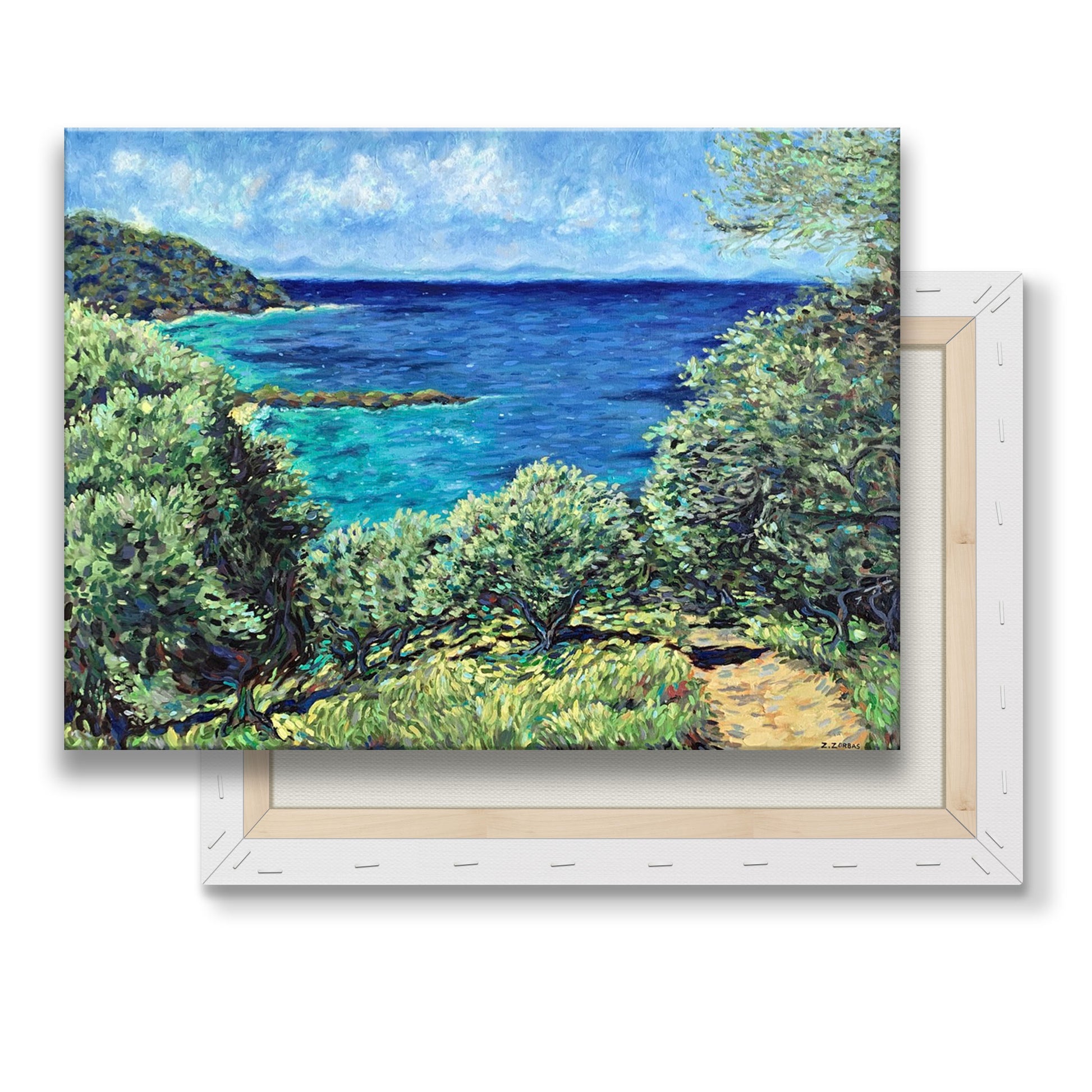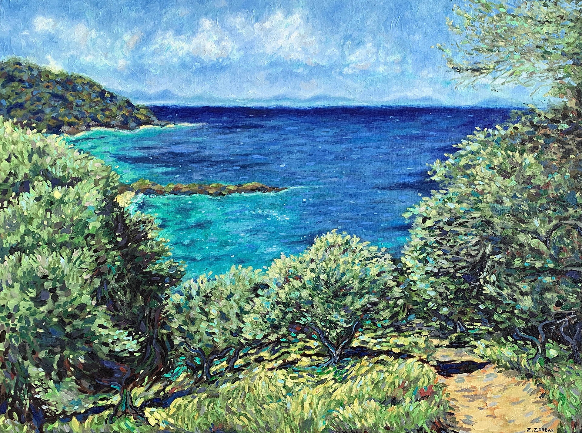 Ένας πίνακας που έφτιαξα βασισμένος σε αναμνήσεις από το ταξίδι μας στην Κέρκυρα. Ψάχναμε να εξερευνήσουμε μέρη εκτός κεντρικού δρόμου για κρυφές παραλίες και τοπία. Στρίψαμε δεξιά σε έναν τυχαίο, μικρό δρόμο που κατηφορίζει προς τη θάλασσα. Οδηγήσαμε προς τα κάτω, βρήκαμε ένα μέρος για να παρκάρουμε και περπατήσαμε για το υπόλοιπο της διαδρομής.