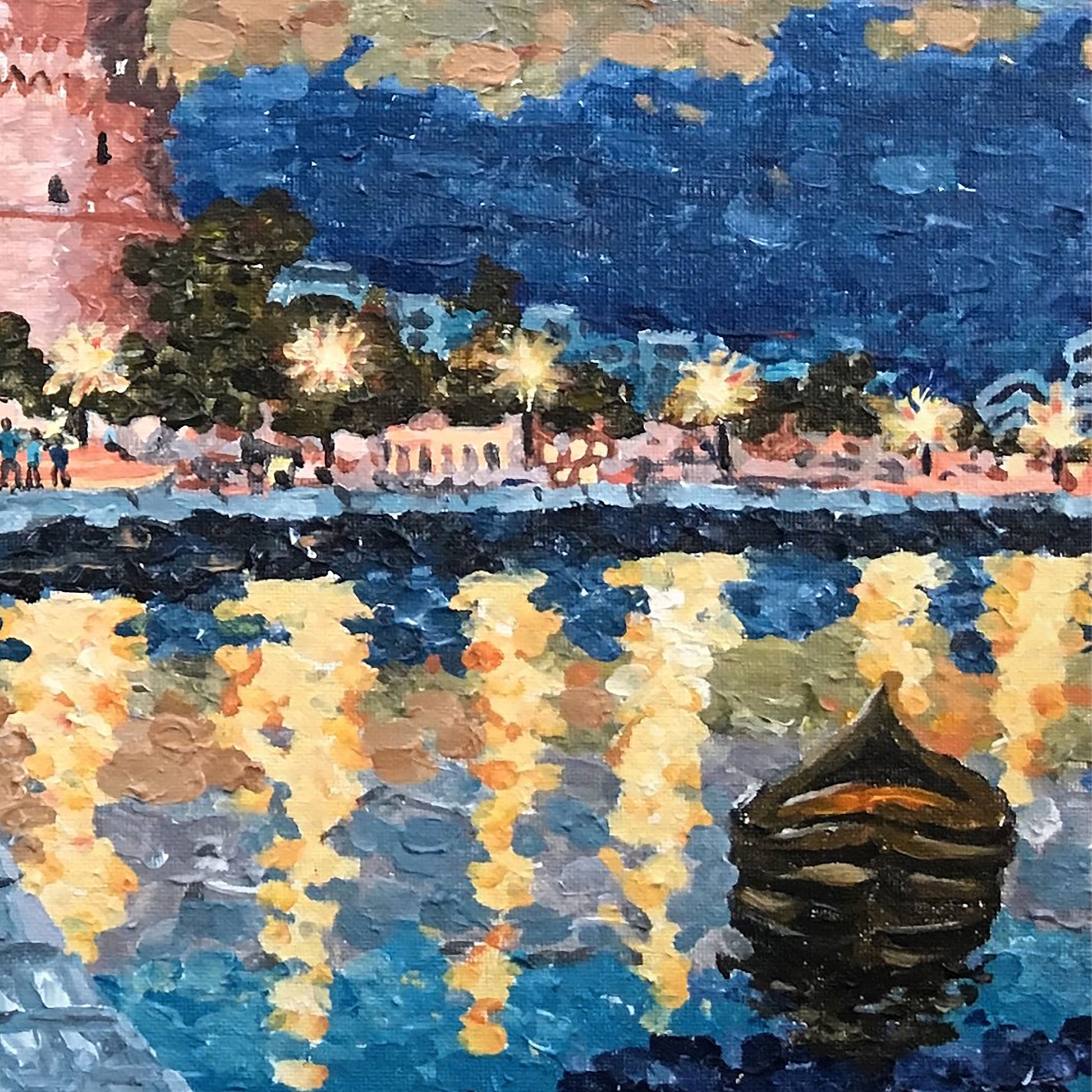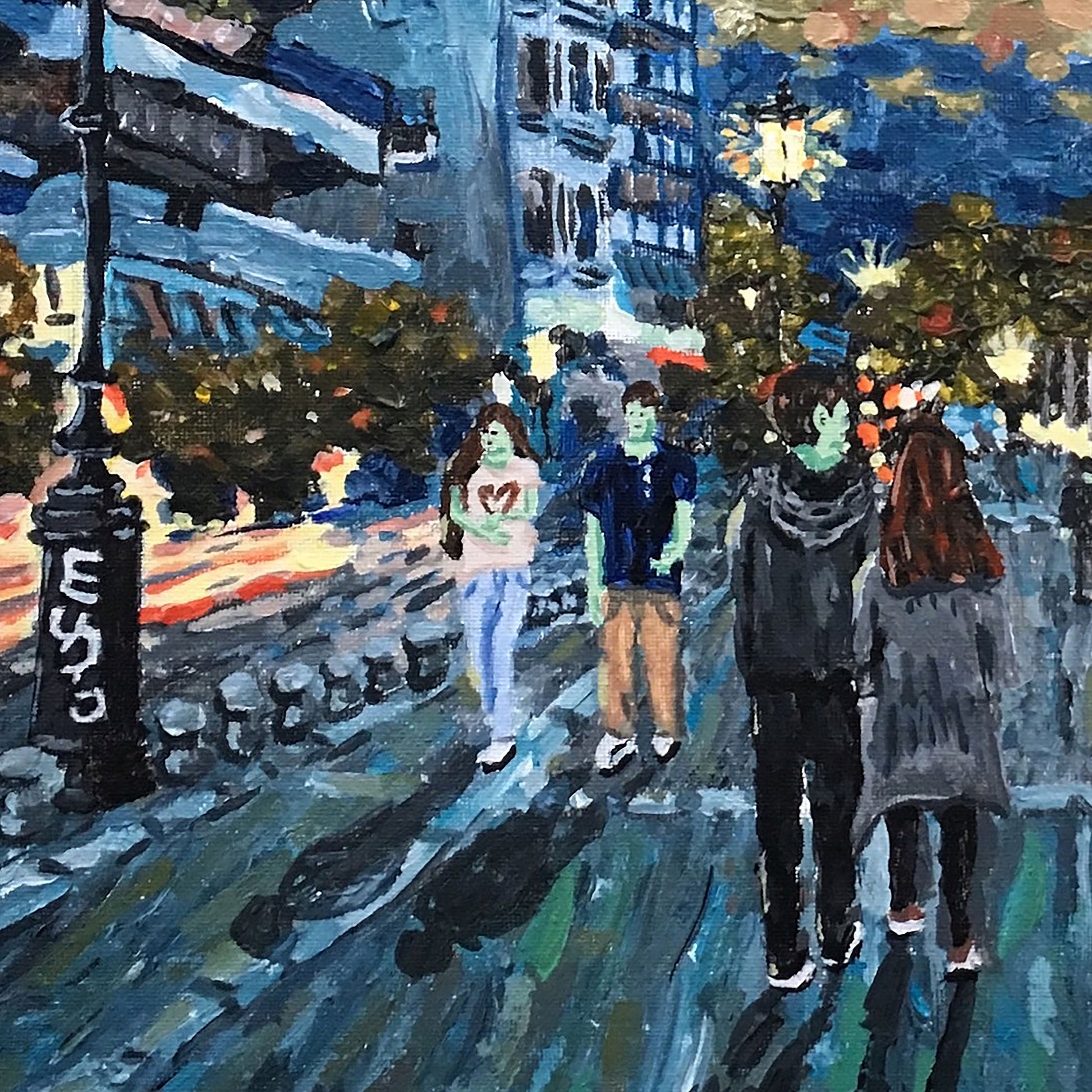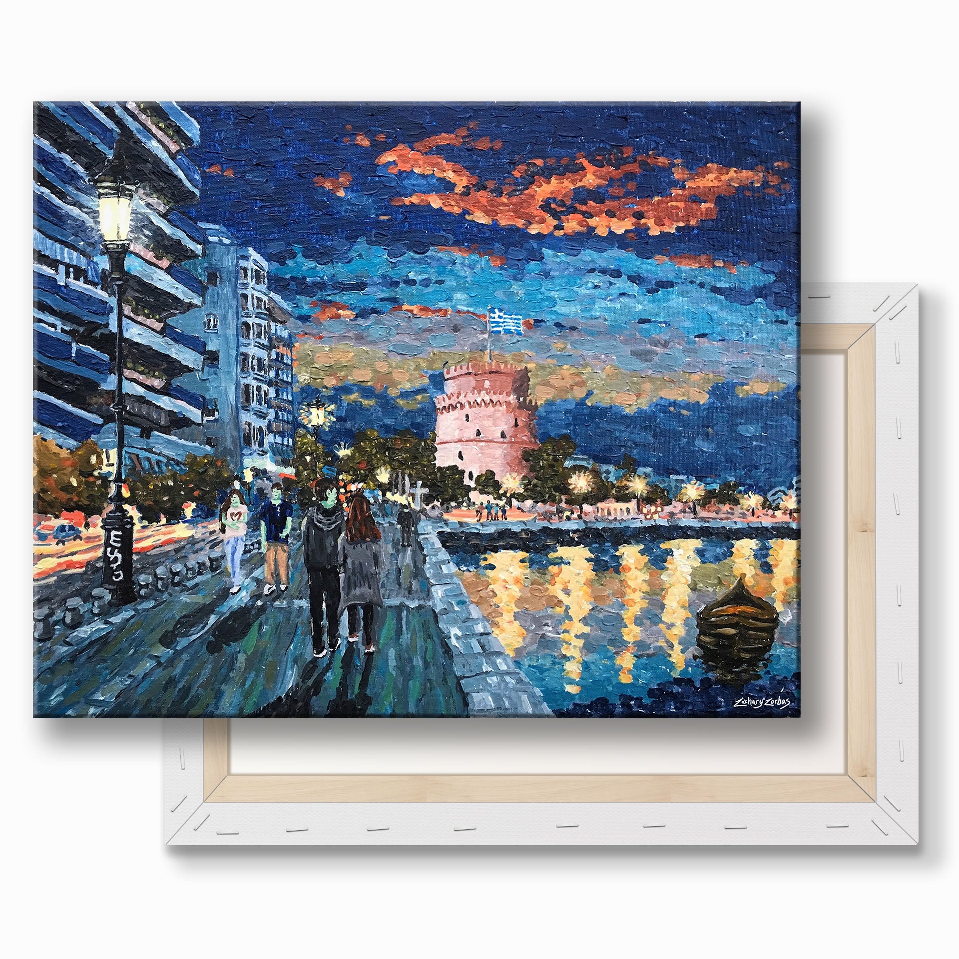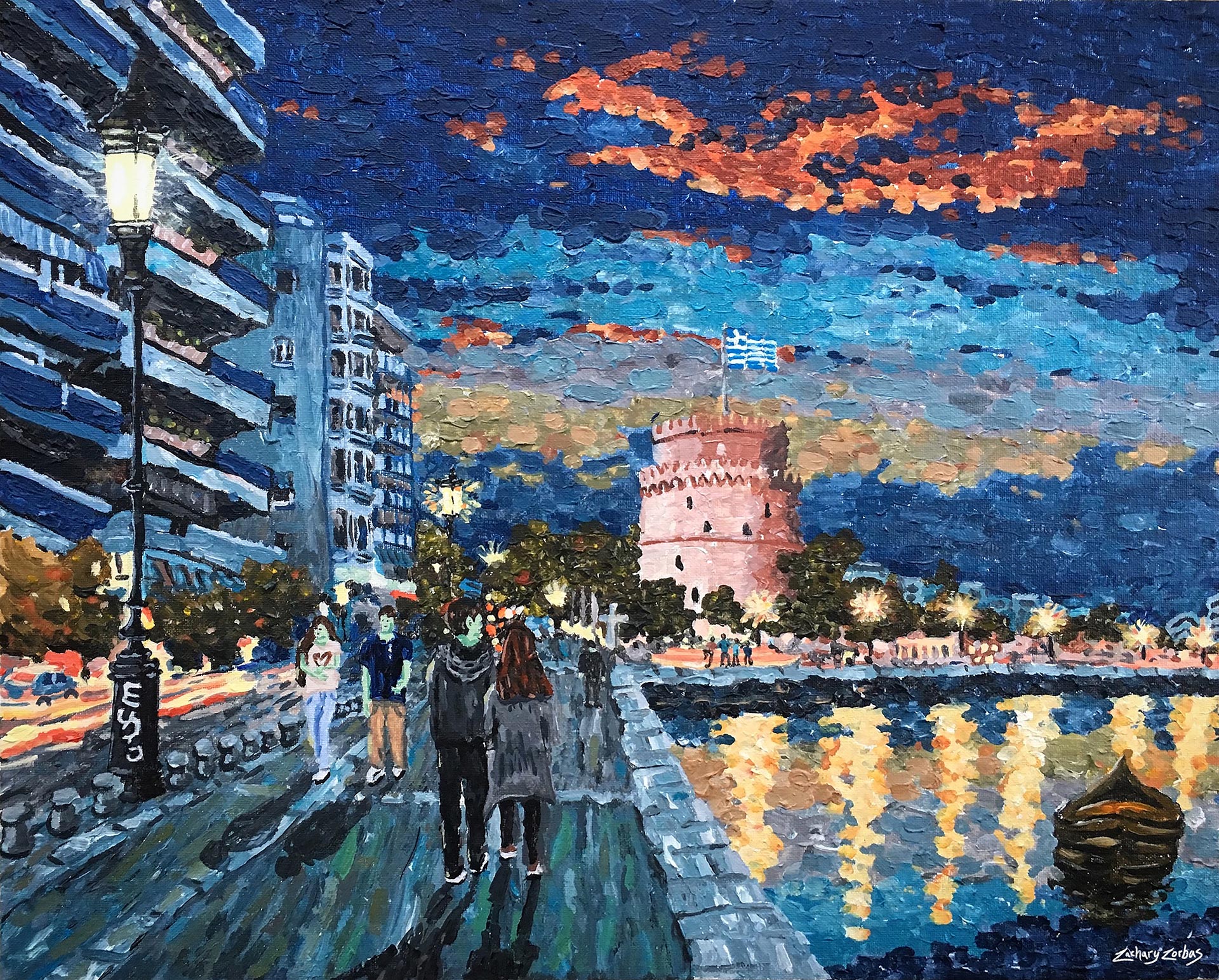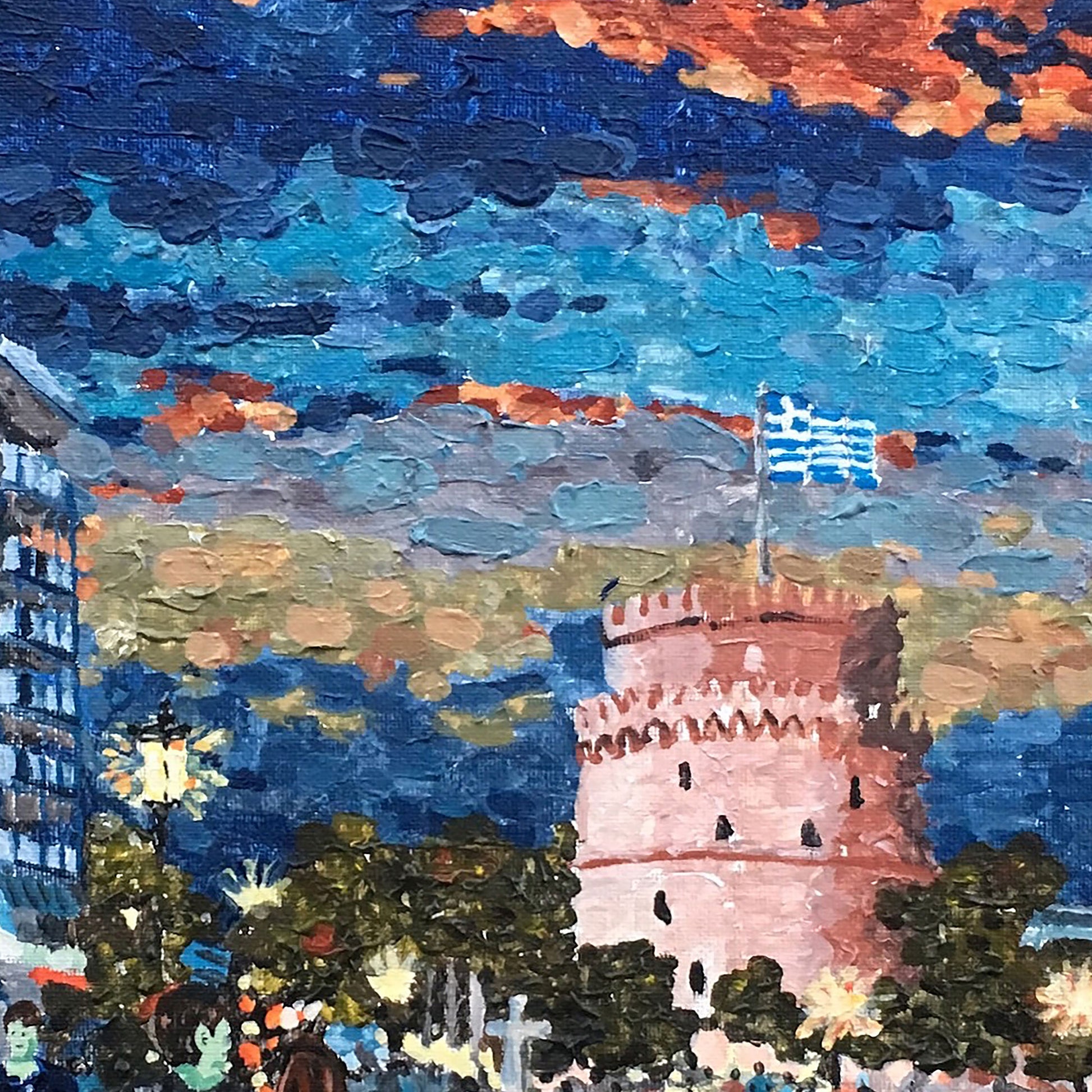 Ένας πίνακας που έφτιαξα βασισμένος στις αναμνήσεις μου από το ταξίδι μου στη Θεσσαλονίκη. Ήταν το πρώτο μου ταξίδι στην Ελλάδα μετά από αρκετά χρόνια. Έφτασα στο ξενοδοχείο μου το βράδυ, περίπου στις 9 μ.μ. Υπήρχε πολλή ζωή στους δρόμους και οι άνθρωποι διασκέδαζαν. Είναι συναρπαστικό που επέστρεψα. Θα μείνω ένα βράδυ πριν πάω στη Θεσσαλονίκη.