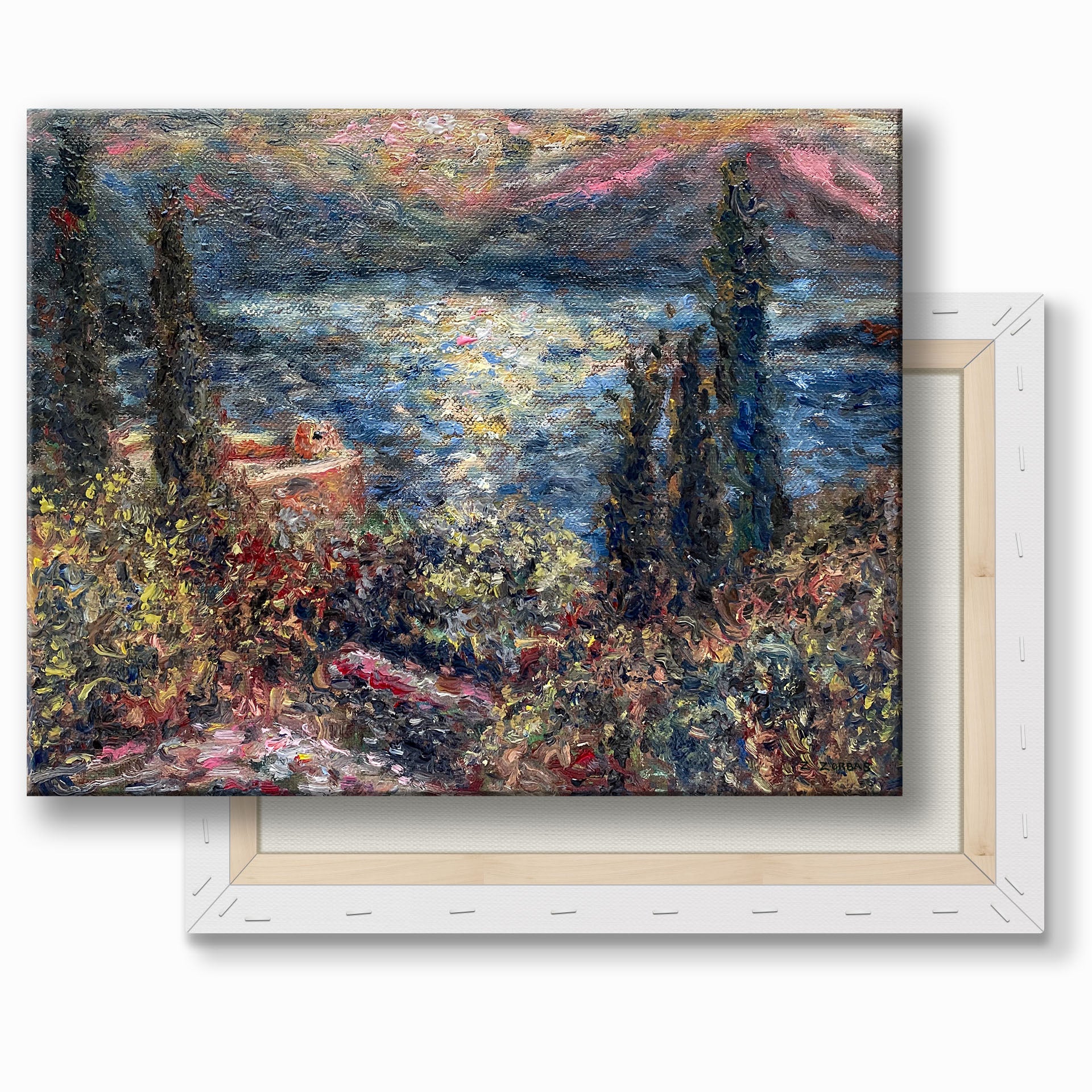 • Εικόνα τυπωμένη από εκτυπωτή inkjet σε καμβά της πρωτότυπης ελαιογραφίας του Ζαχαρία Ζορμπά «Θέα του Σαρωνικού από την Αίγινα»