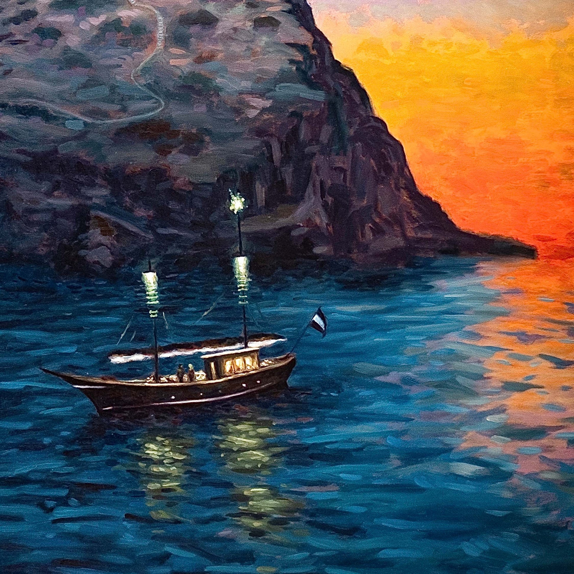 Ένα γαλήνιο θαλασσινό τοπίο με βάρκες κάτω από τα φώτα των μακρινών αρχαίων ναών, που προκαλεί μια αίσθηση γαλήνης και ιστορίας. Ένα ζωντανό ηλιοβασίλεμα ρίχνει πορτοκαλί αποχρώσεις στον ουρανό, που σταδιακά αναμειγνύεται με την πιο βαθιά νύχτα.
