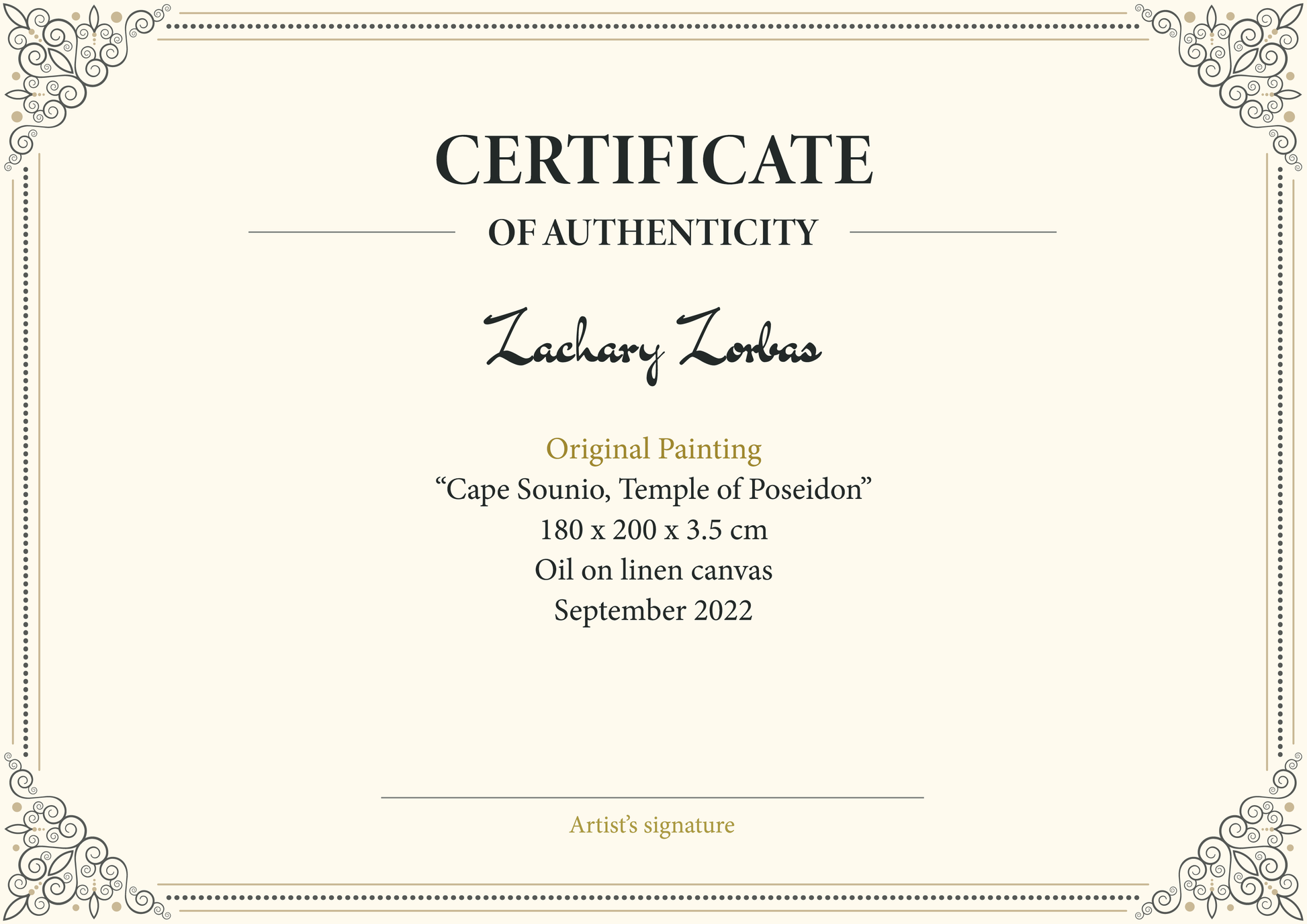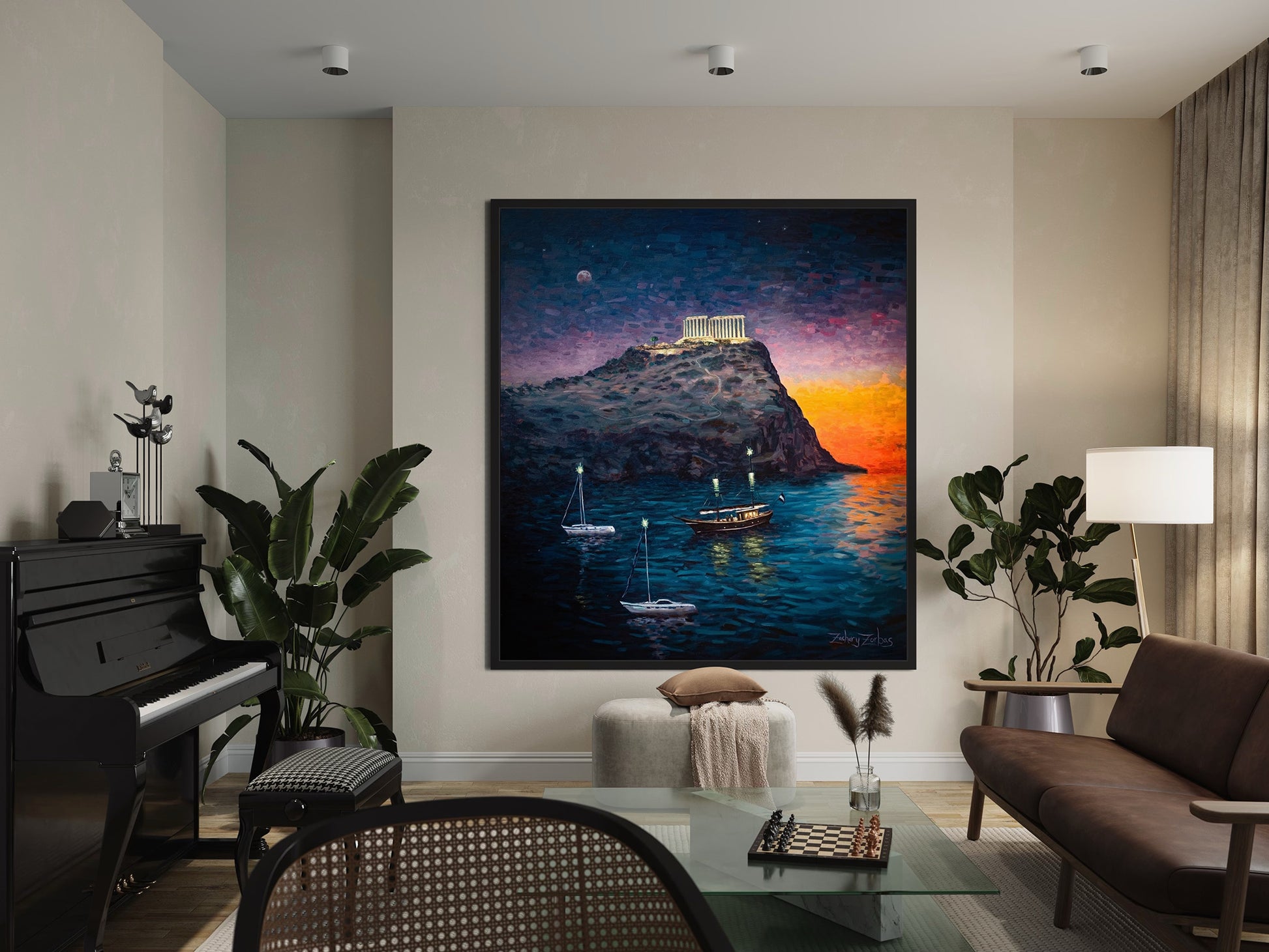 Οι παππούδες μου περνούσαν πολύ χρόνο στο Σούνιο και στην Αθηναϊκή Ριβιέρα. Ήταν ένα από τα πρώτα μέρη που πήγα όταν ήρθα για πρώτη φορά στην Ελλάδα το 2010. Έχω επισκεφθεί εκεί αρκετές φορές μέχρι τώρα για κολύμπι και ζωγραφική. Υπάρχει μια μικρή παραλία στους πρόποδες του ναού από την οποία είναι φτιαγμένος αυτός ο πίνακας. Βρίσκεται κοντά στο Grecotel Cape Sounio, το οποίο είναι ένα εξαιρετικά όμορφο ξενοδοχείο και θέρετρο.