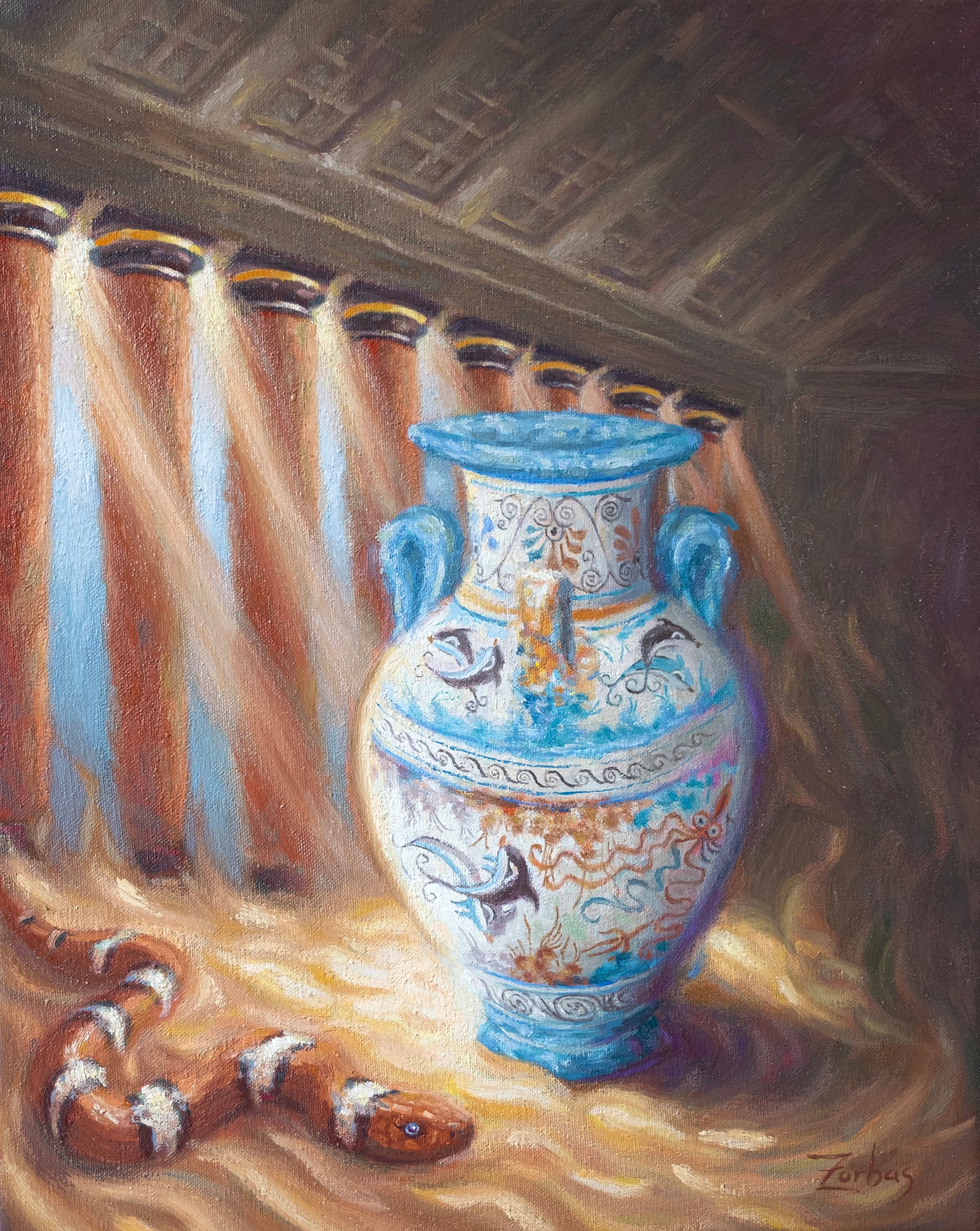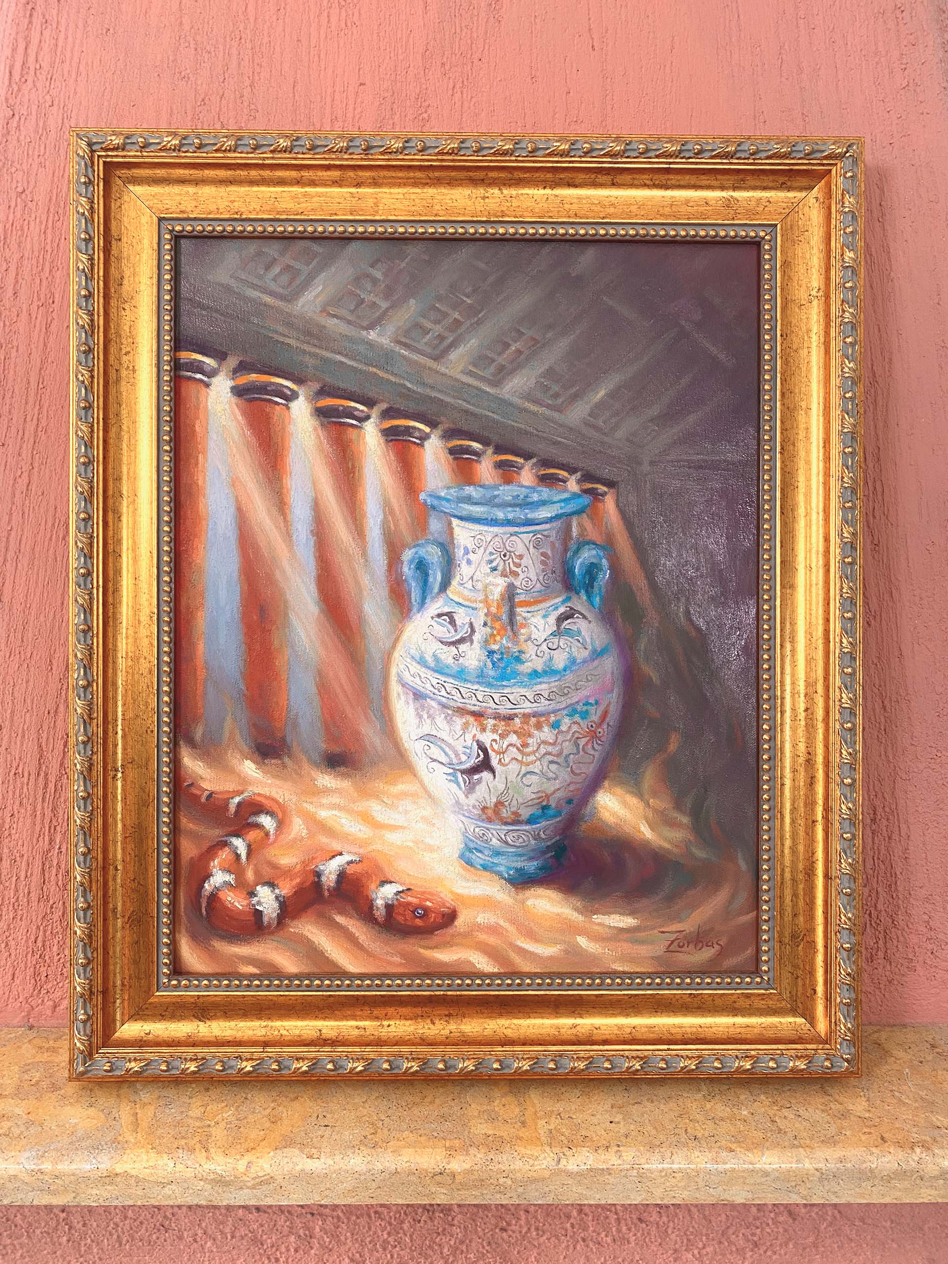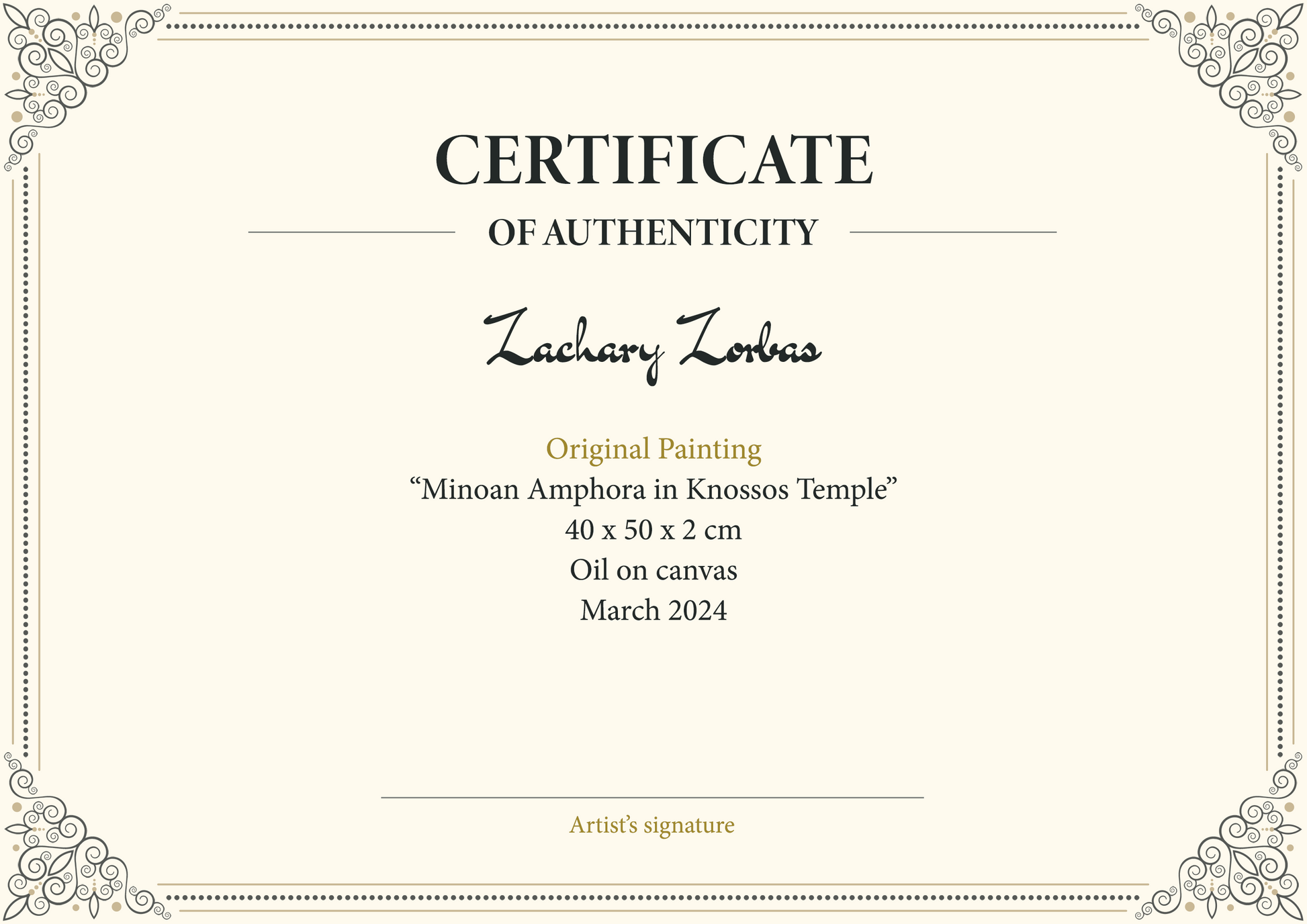 - Πρωτότυπος πίνακας του Ζαχαρία Ζορμπά με τίτλο "Μινωικός Αμφορέας στον Ναό της Κνωσού, Κρήτη", χειροποίητος στην Αίγινα, Ελλάδα