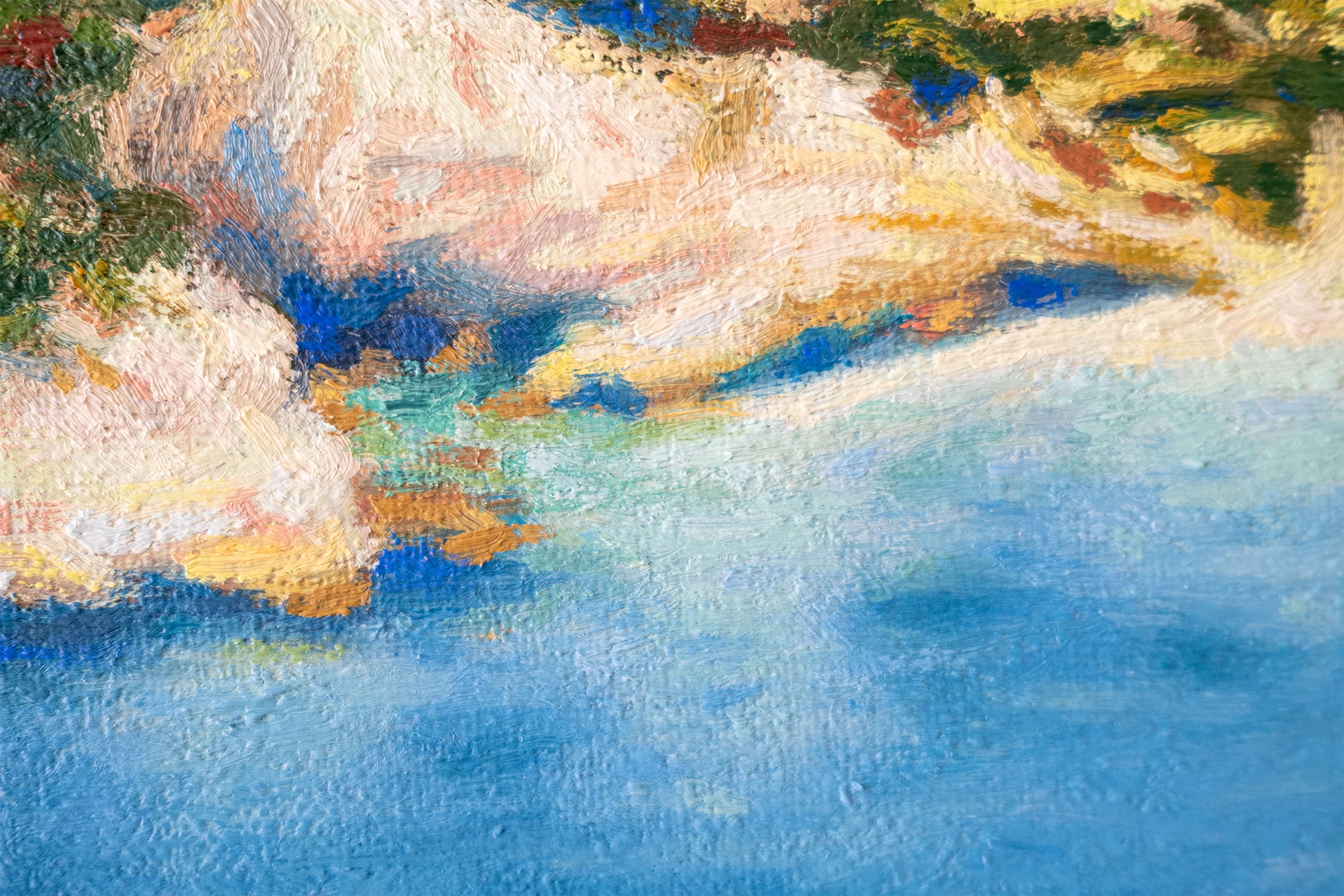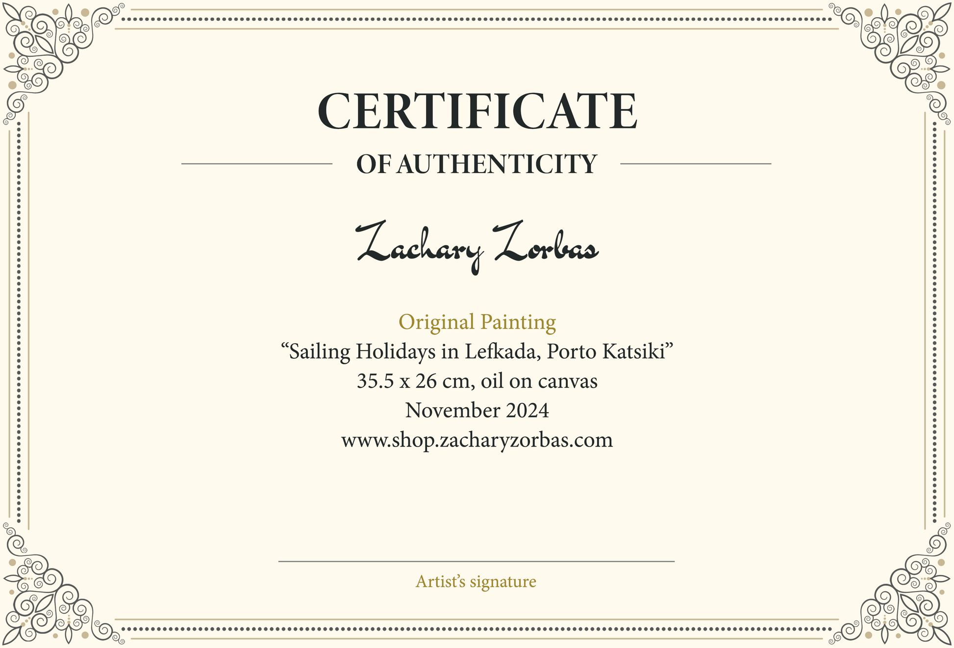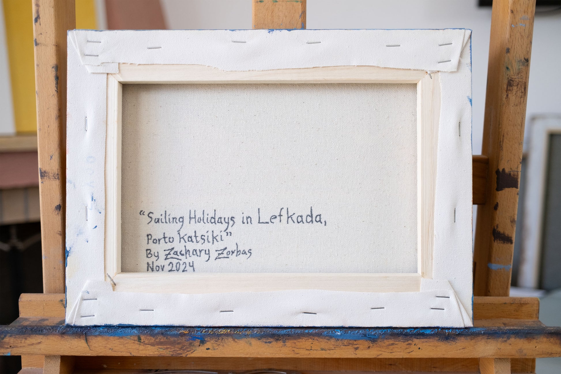 • Πρωτότυπος πίνακας του Ζαχαρία Ζορμπά με τίτλο «Ιστιοπλοΐα στη Λευκάδα, Πόρτο Κατσίκι» χειροποίητος στην Αίγινα