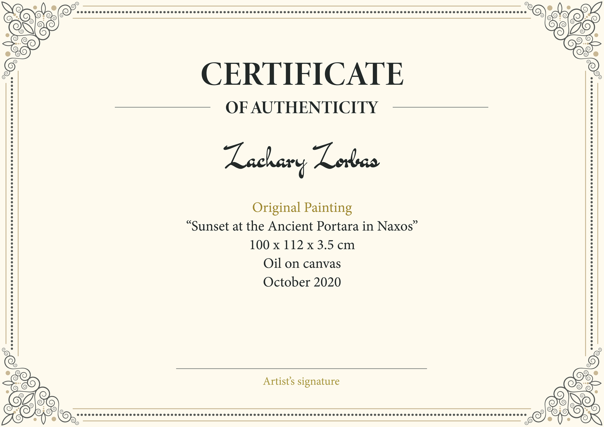 • Πρωτότυπος πίνακας του Ζαχαρία Ζορμπά με τίτλο "Ηλιοβασίλεμα στην Αρχαία Πορτάρα στη Νάξο", χειροποίητος στην Αράχωβα