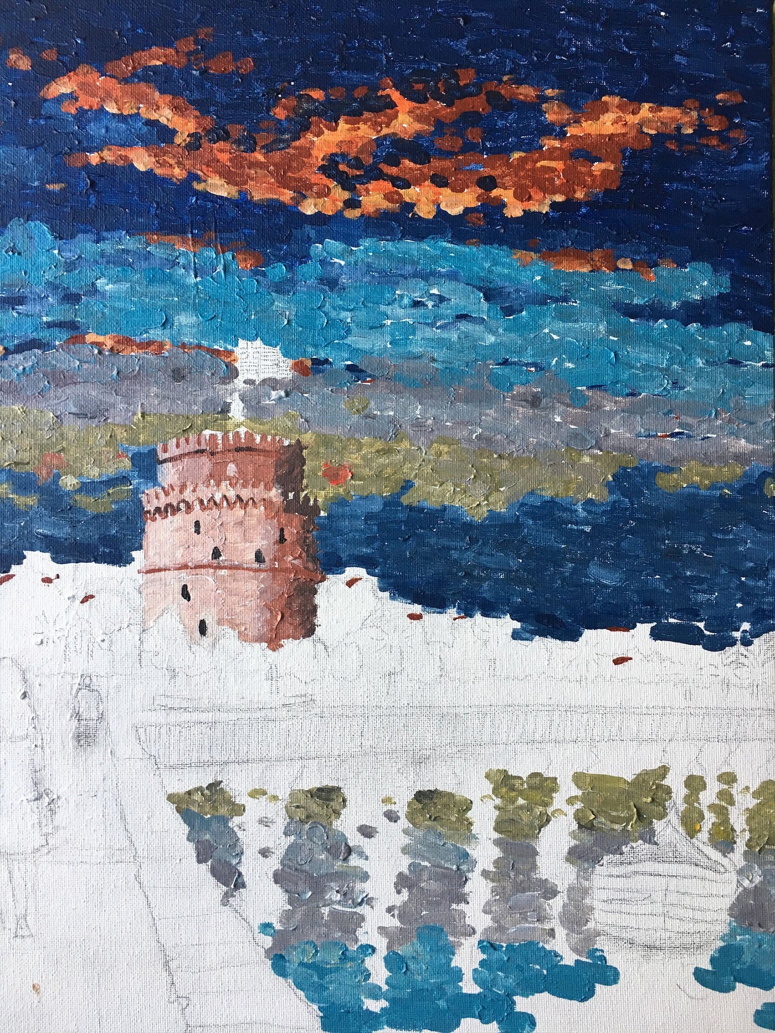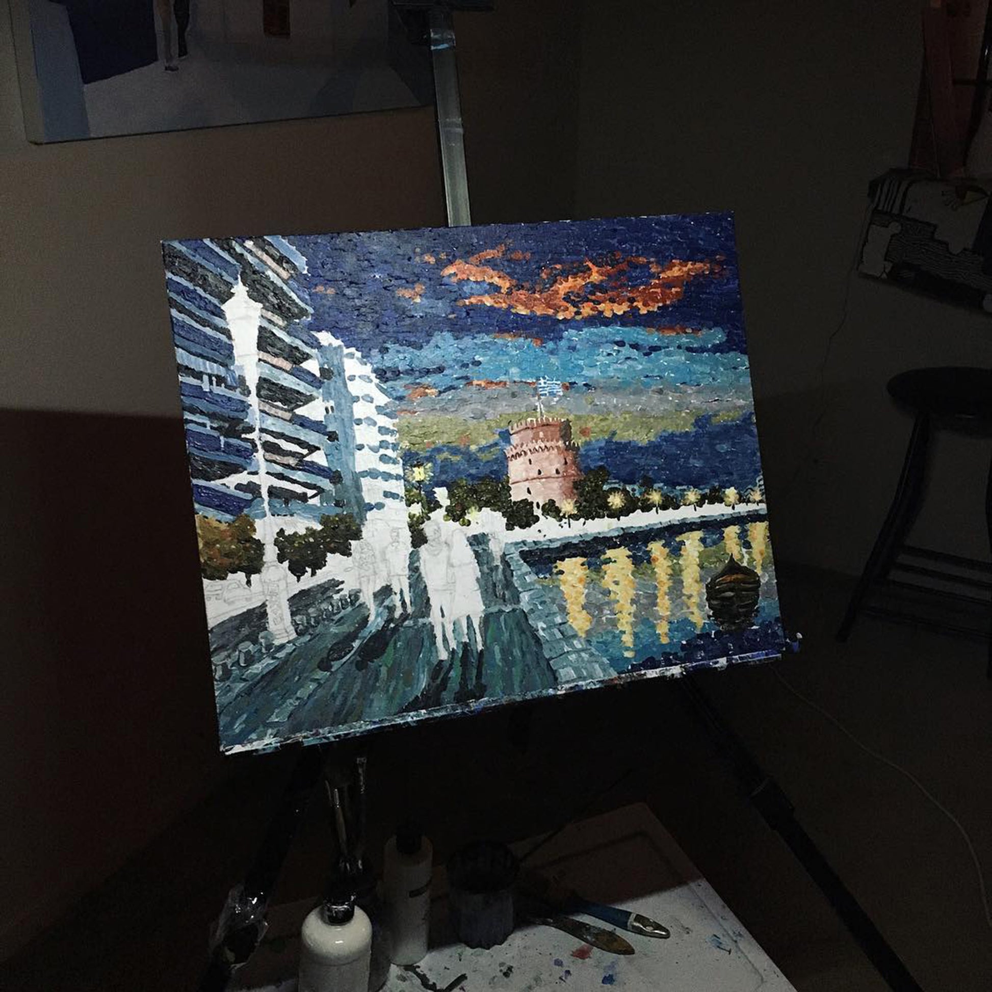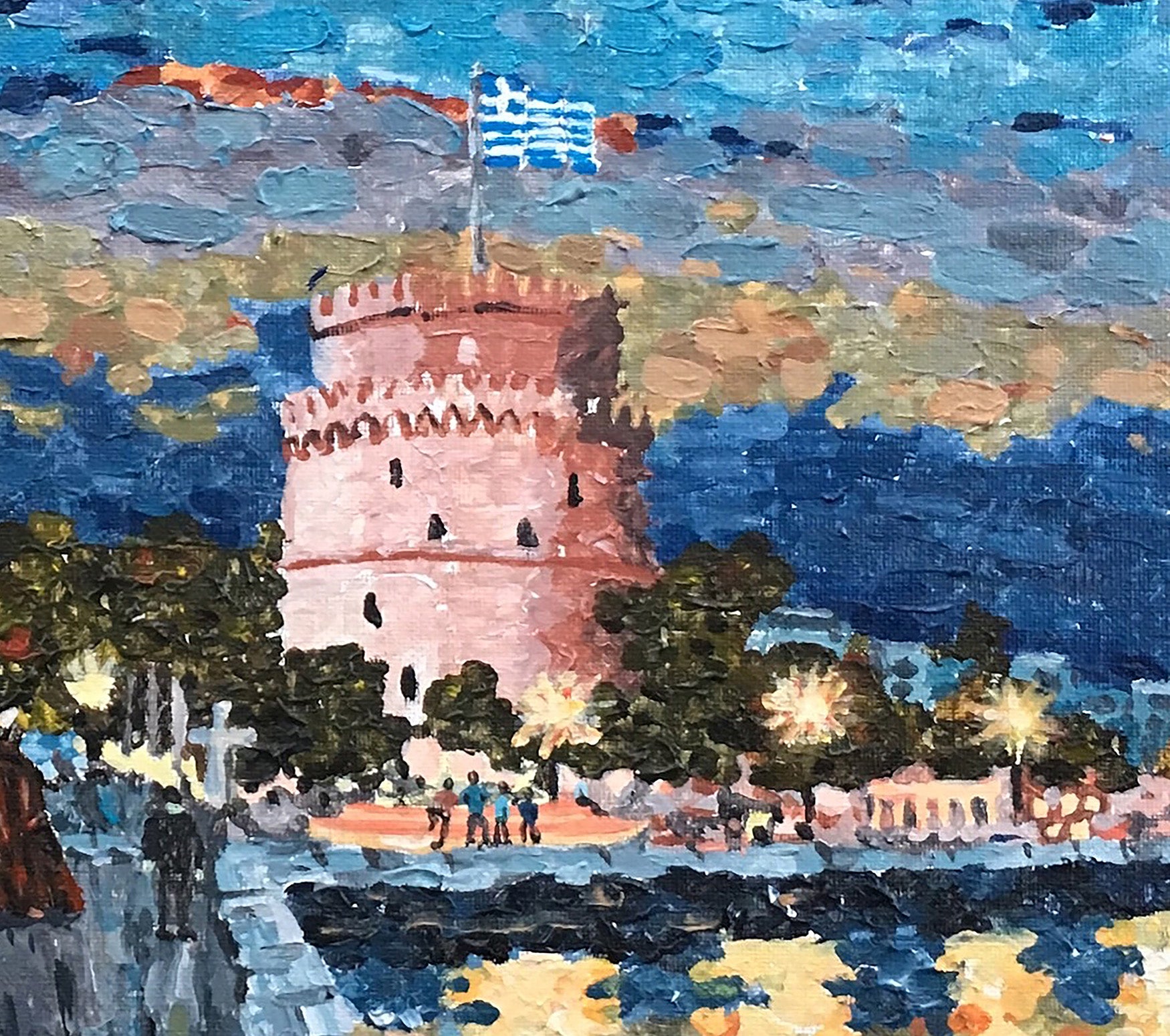 Ένας πίνακας που έφτιαξα βασισμένος στις αναμνήσεις μου από το ταξίδι μου στη Θεσσαλονίκη. Ήταν το πρώτο μου ταξίδι στην Ελλάδα μετά από αρκετά χρόνια. Έφτασα στο ξενοδοχείο μου το βράδυ, περίπου στις 9 μ.μ. Υπήρχε πολλή ζωή στους δρόμους και οι άνθρωποι διασκέδαζαν. Είναι συναρπαστικό που επέστρεψα. Θα μείνω ένα βράδυ πριν πάω στη Θεσσαλονίκη.