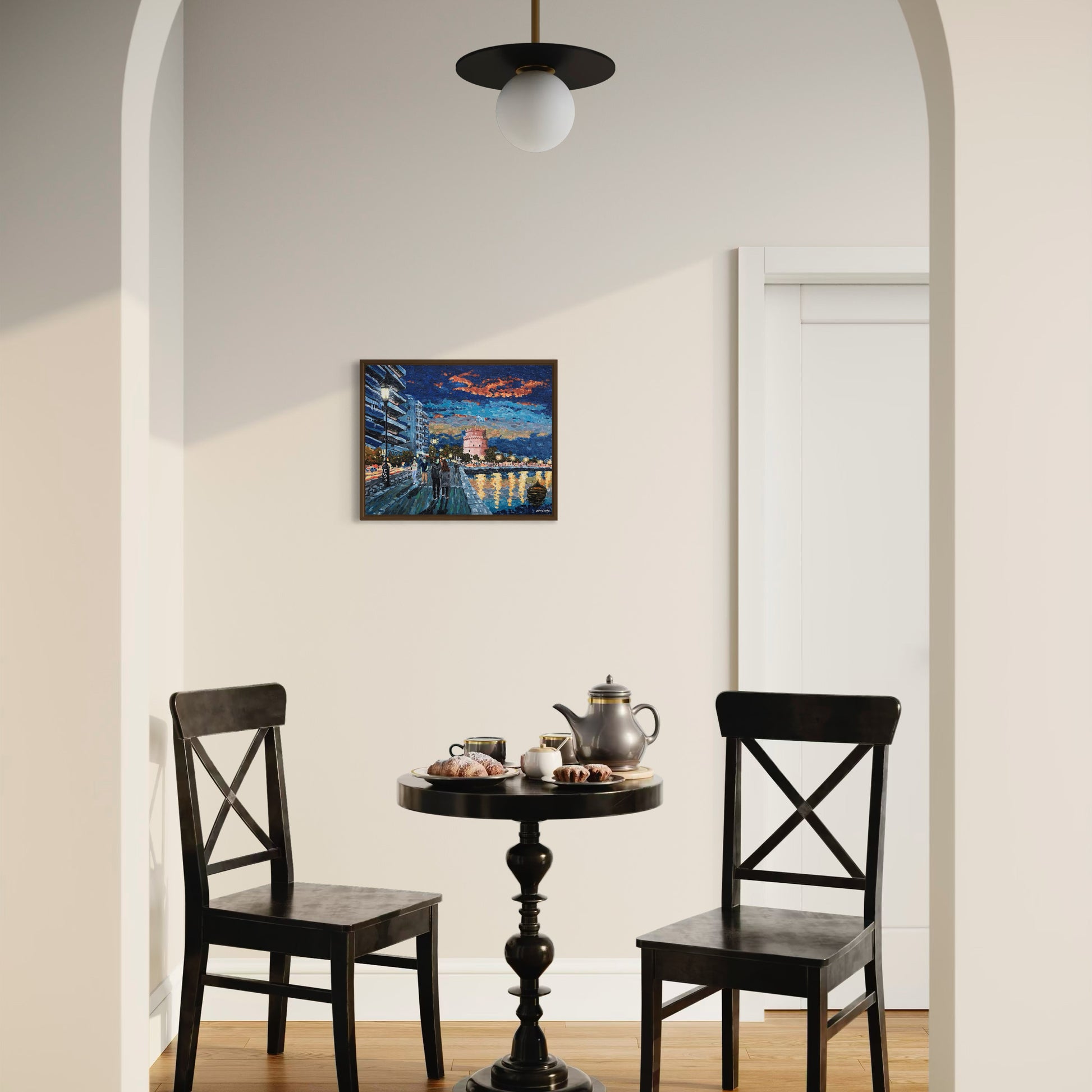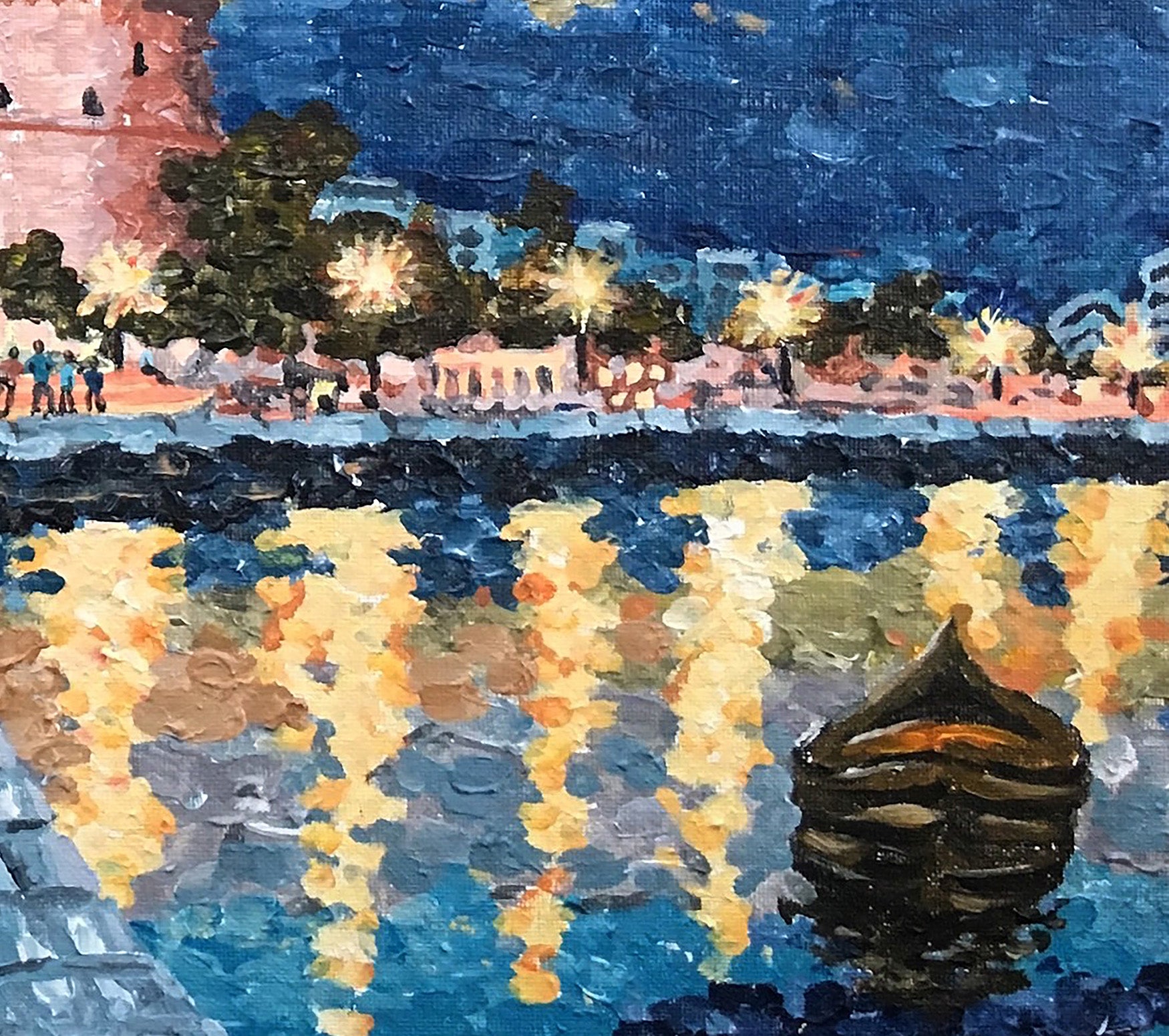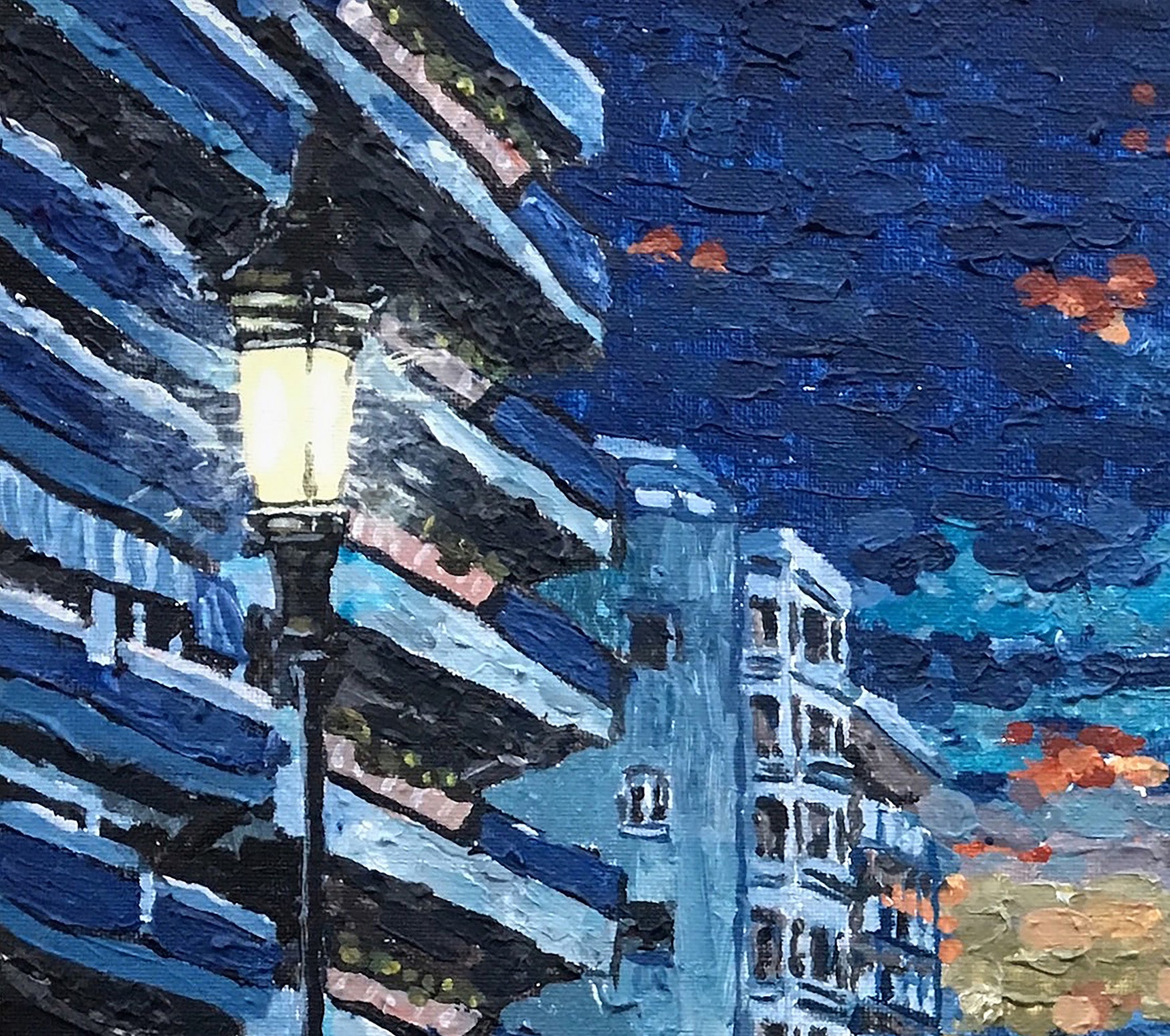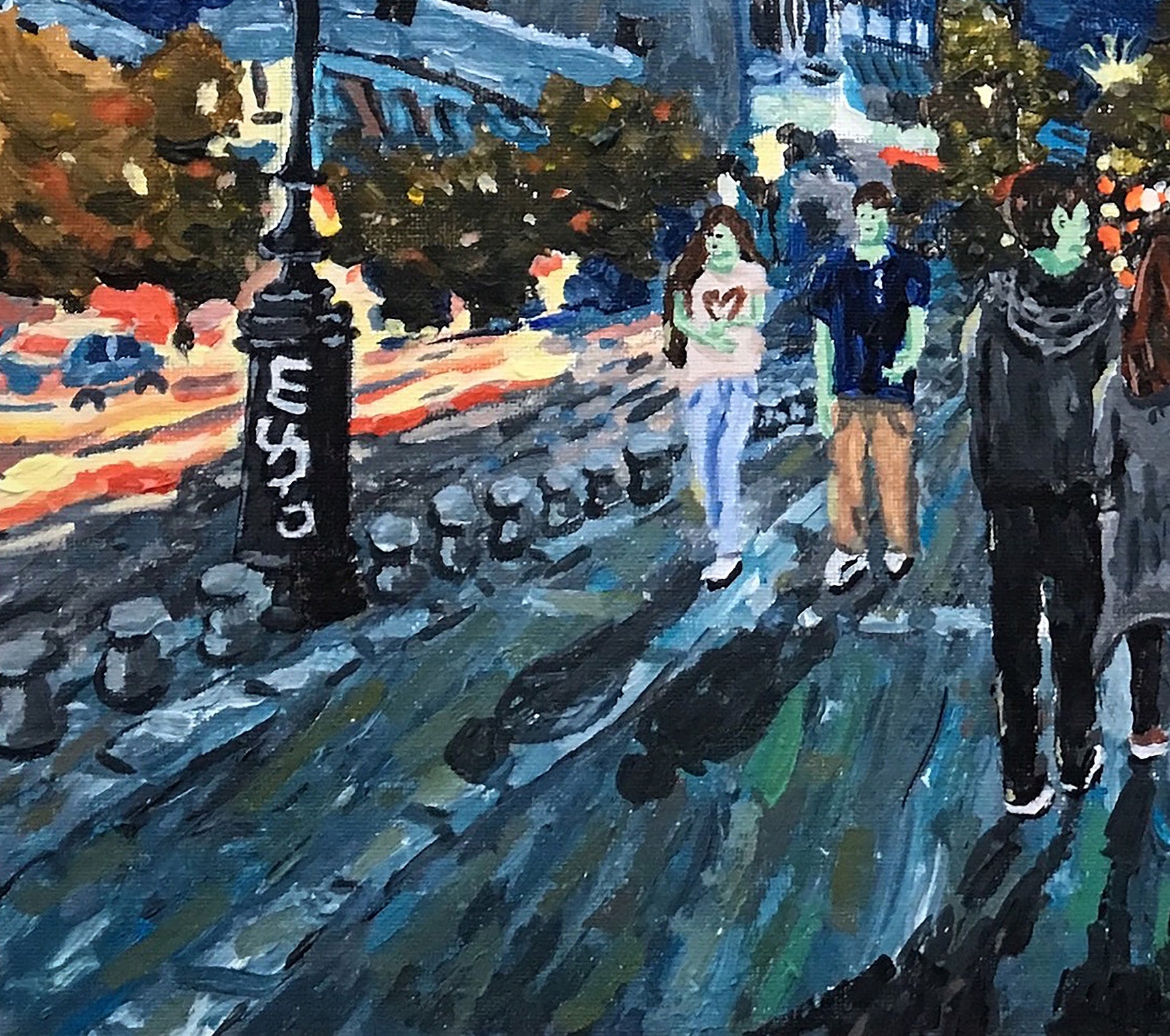 Ένας πίνακας που έφτιαξα βασισμένος στις αναμνήσεις μου από το ταξίδι μου στη Θεσσαλονίκη. Ήταν το πρώτο μου ταξίδι στην Ελλάδα μετά από αρκετά χρόνια. Έφτασα στο ξενοδοχείο μου το βράδυ, περίπου στις 9 μ.μ. Υπήρχε πολλή ζωή στους δρόμους και οι άνθρωποι διασκέδαζαν. Είναι συναρπαστικό που επέστρεψα. Θα μείνω ένα βράδυ πριν πάω στη Θεσσαλονίκη.