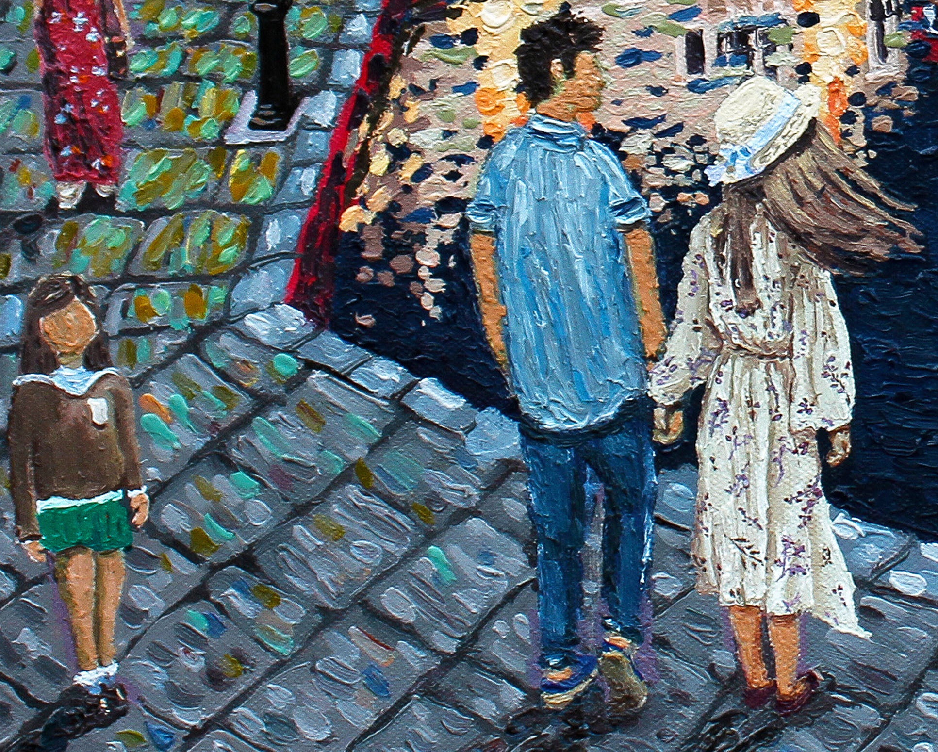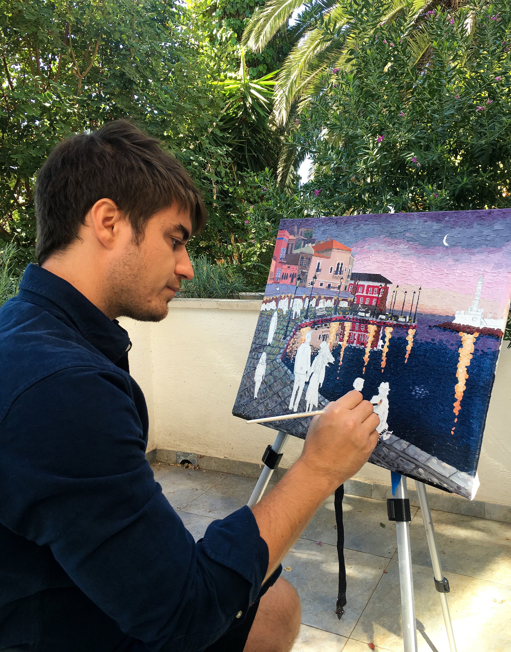 I spent some holiday time in Chania, Crete. My favorite place is the area of the “Old Venetian Port of Chania” with all of its cafes, shops and restaurants formed in a half-circle. One side is looking at another with views of the captivating lighthouse in its Venetian style. The warm summer walks at night with friends. It was here that I realized that I wanted to paint more things like my first painting “Thessaloniki in Memory”. A new collection of memories and moments from travel and life.