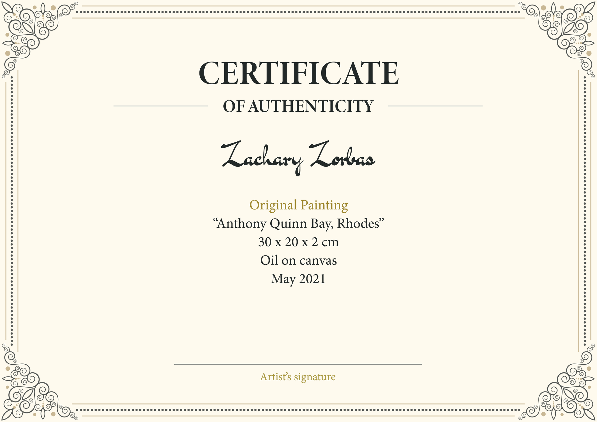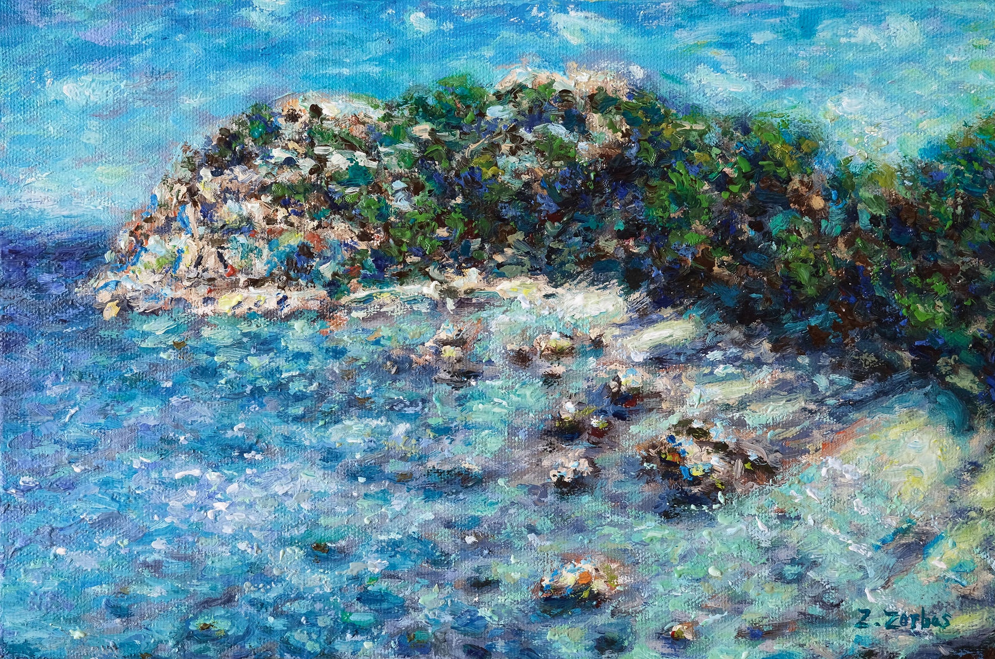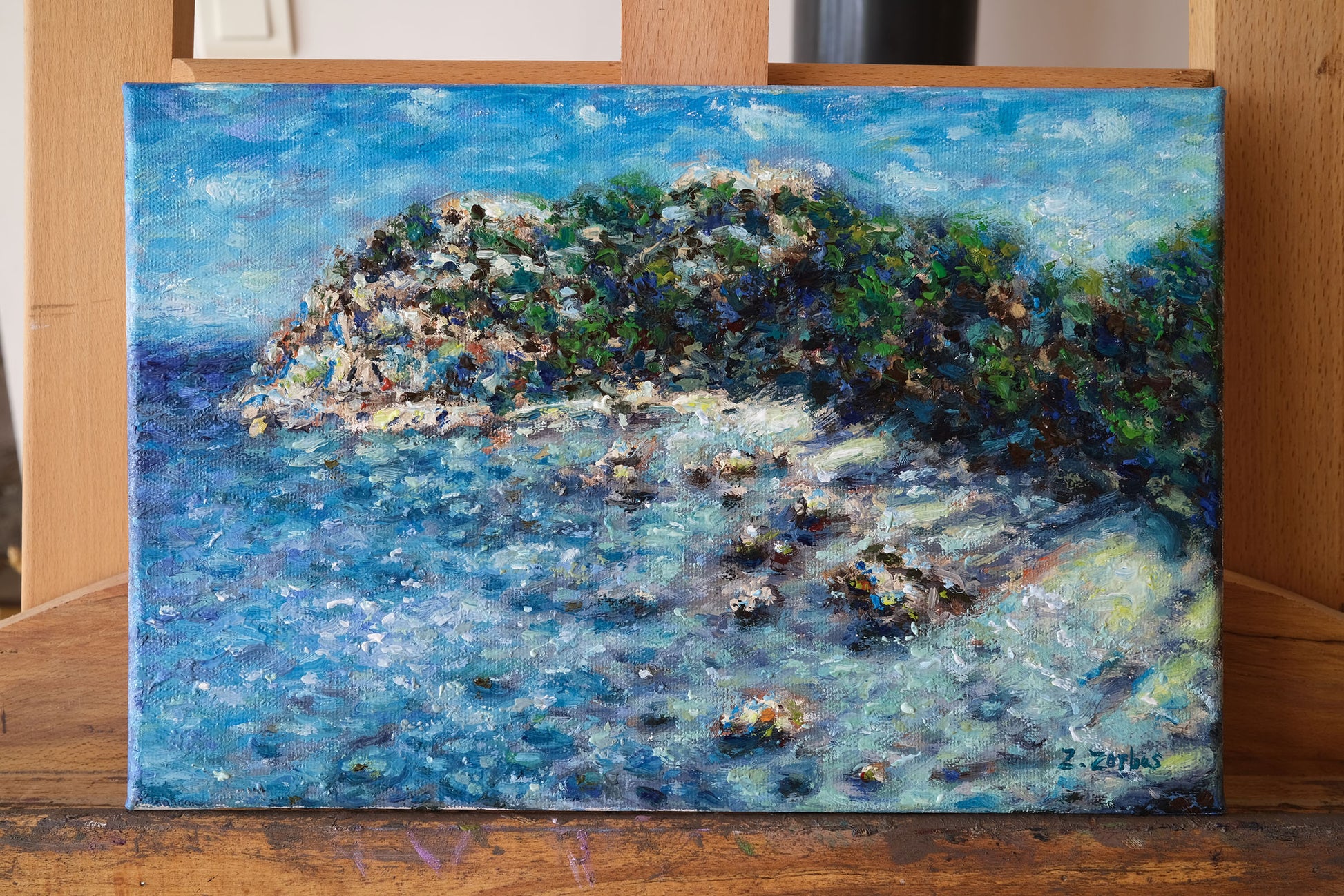 - Original painting by Zachary Zorbas titled “Anthony Quinn Bay, Rhodes” handmade in Athens, Greece