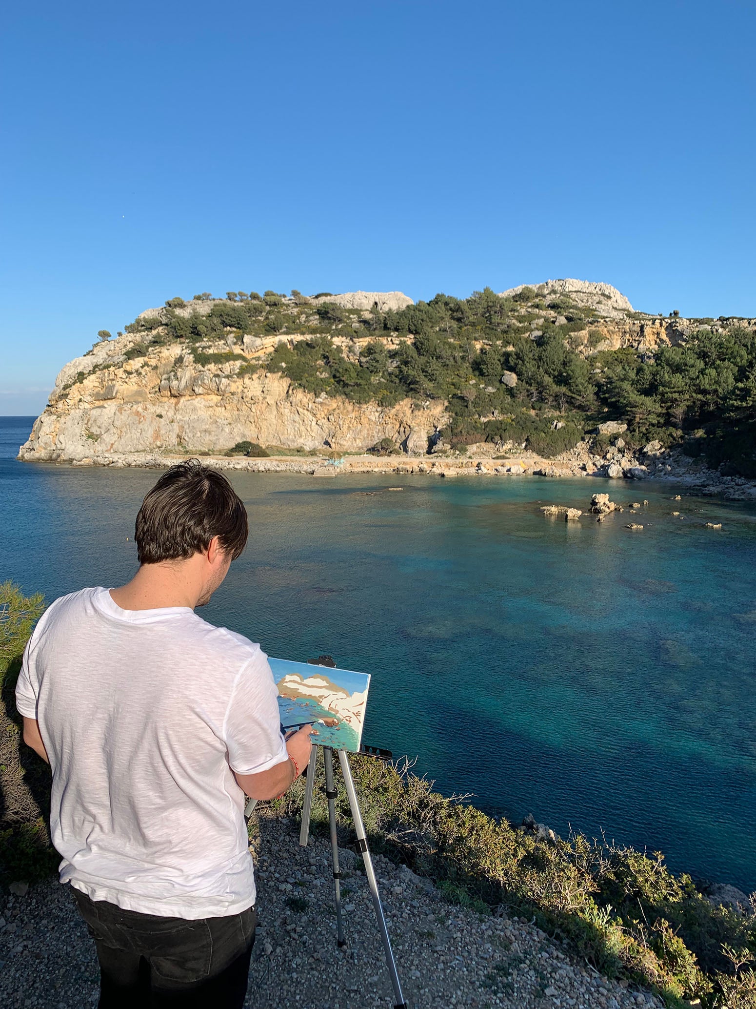 A couple of years ago, my wife and I painted at Anthony Quinn Bay in Rhodes during my birthday holiday. The natural stone surfaces are ideal for painting with plenty of pine trees to provide shade. The lush green vegetation that surrounds the beach gives the sea a deep, emerald color.