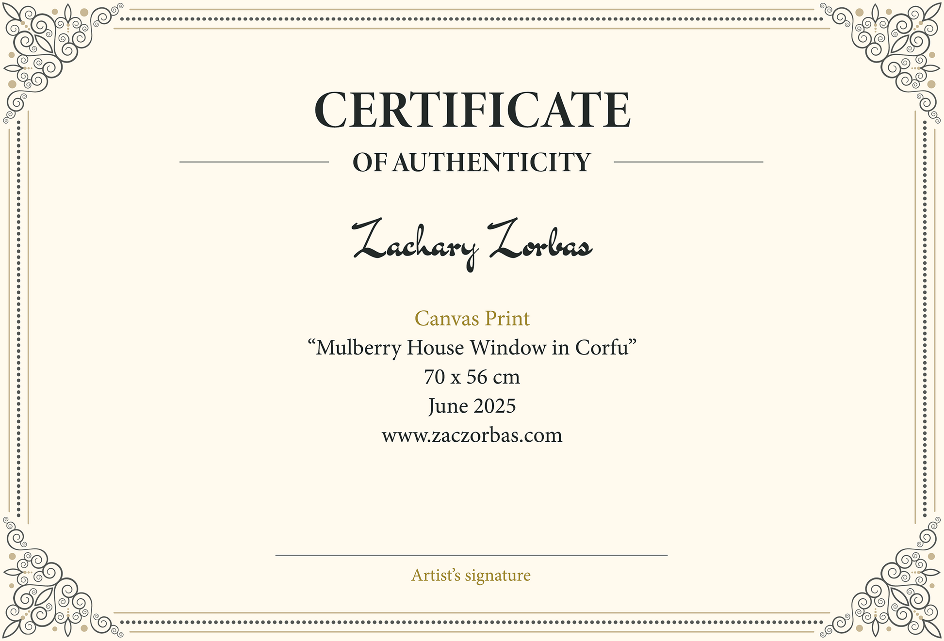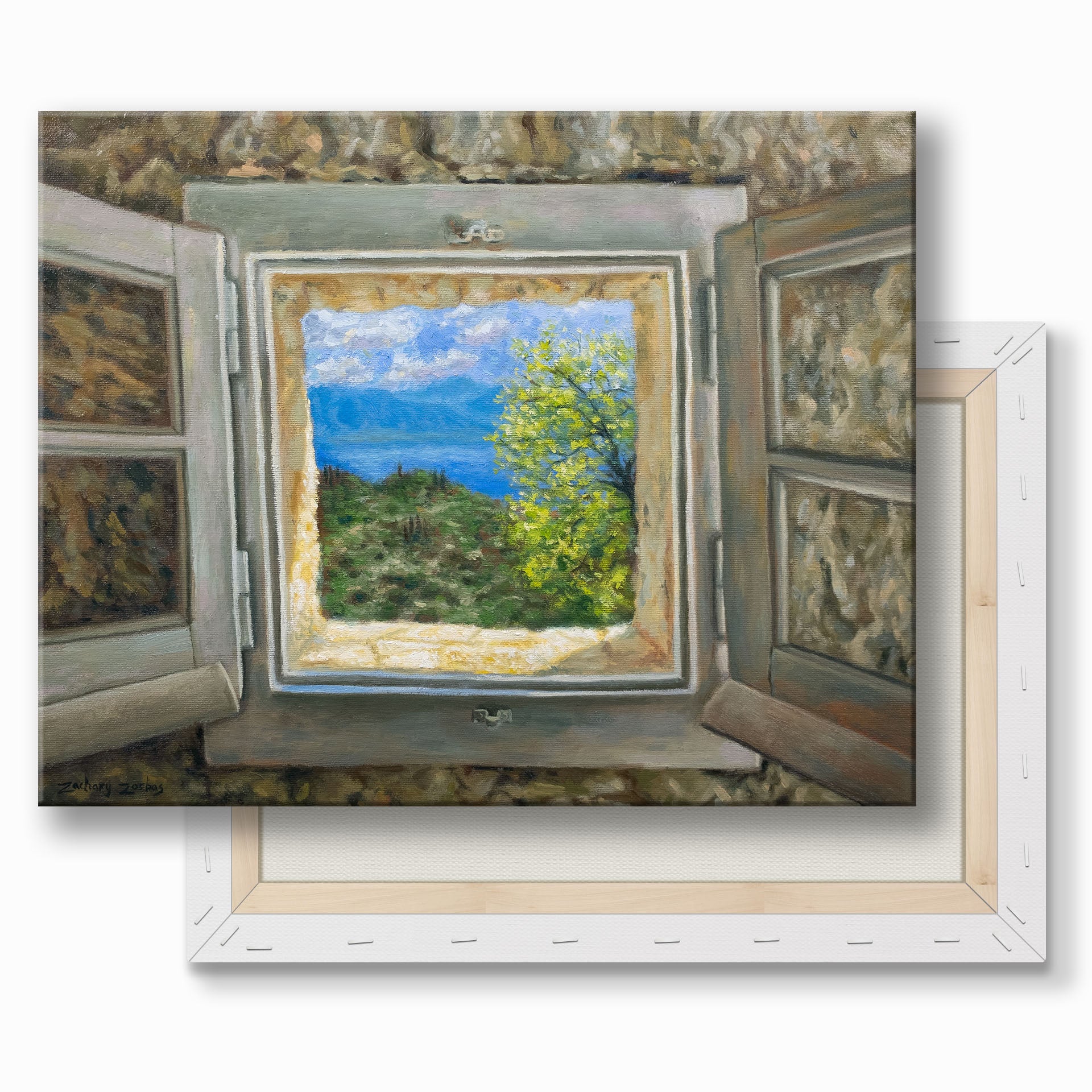 • Image printed from an inkjet printer onto canvas of Zachary Zorbas' original “Mulberry House Window in Corfu” oil painting