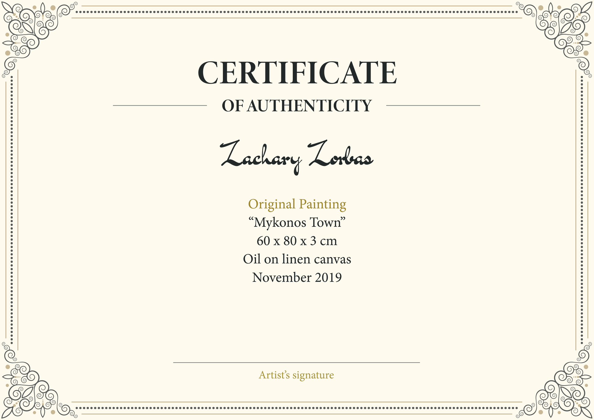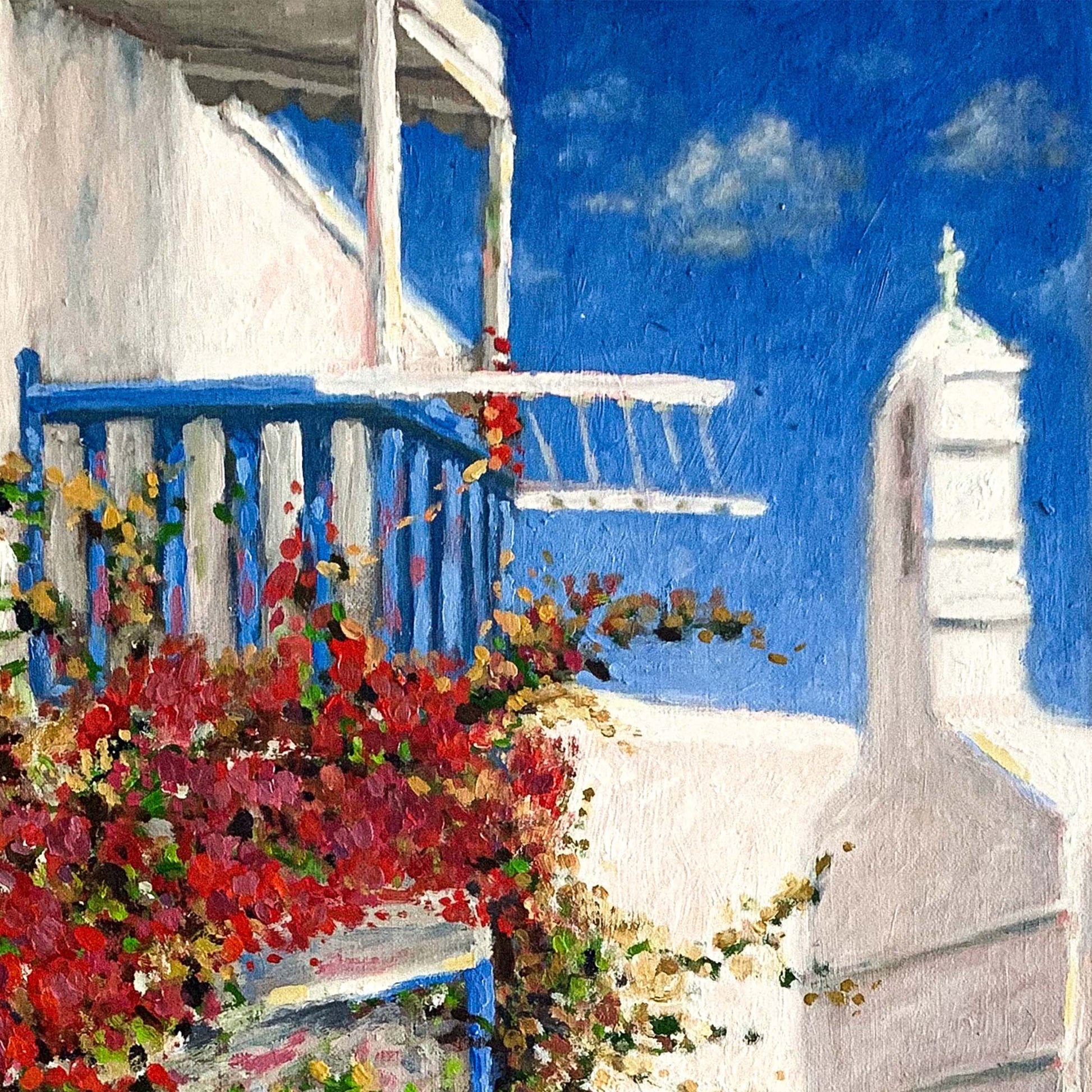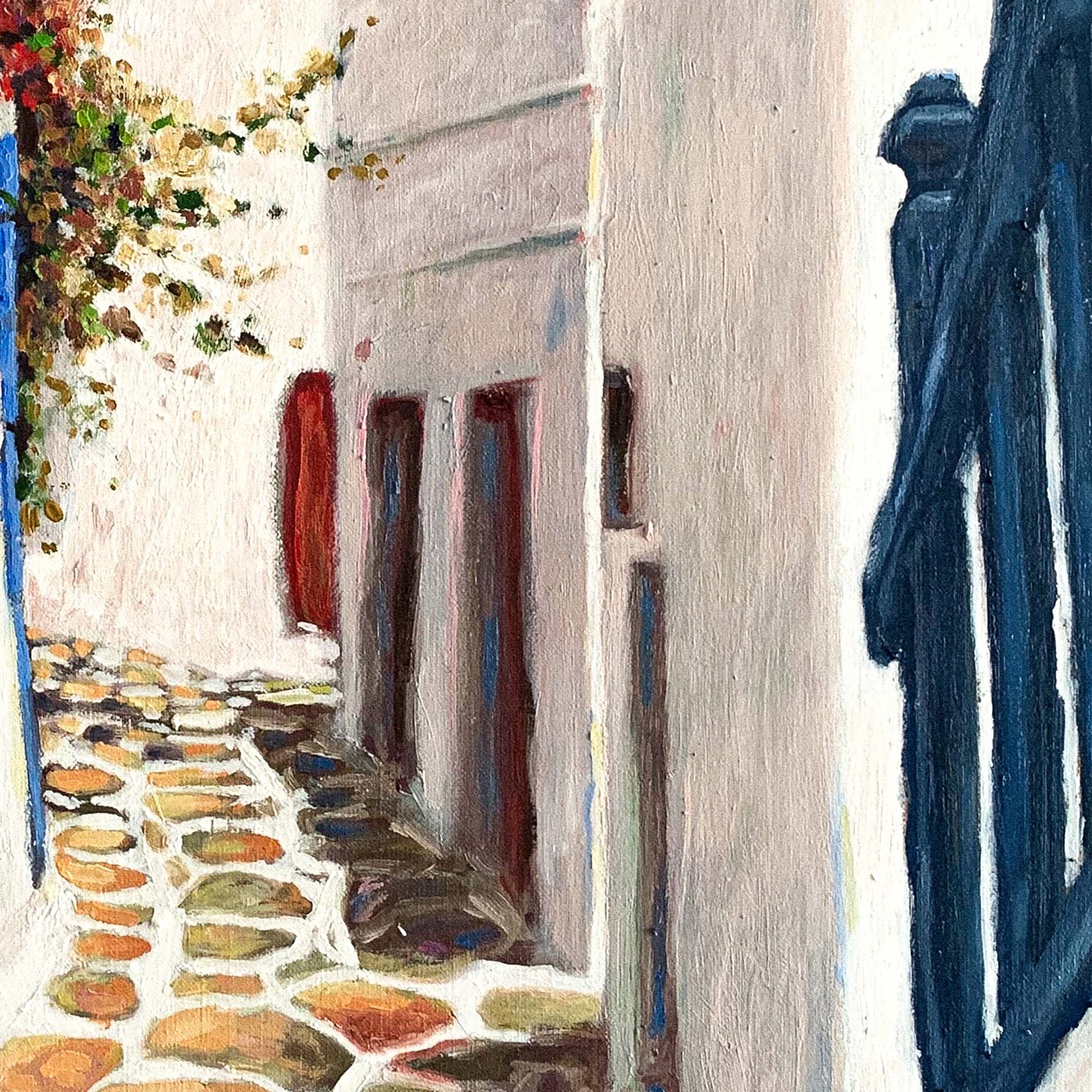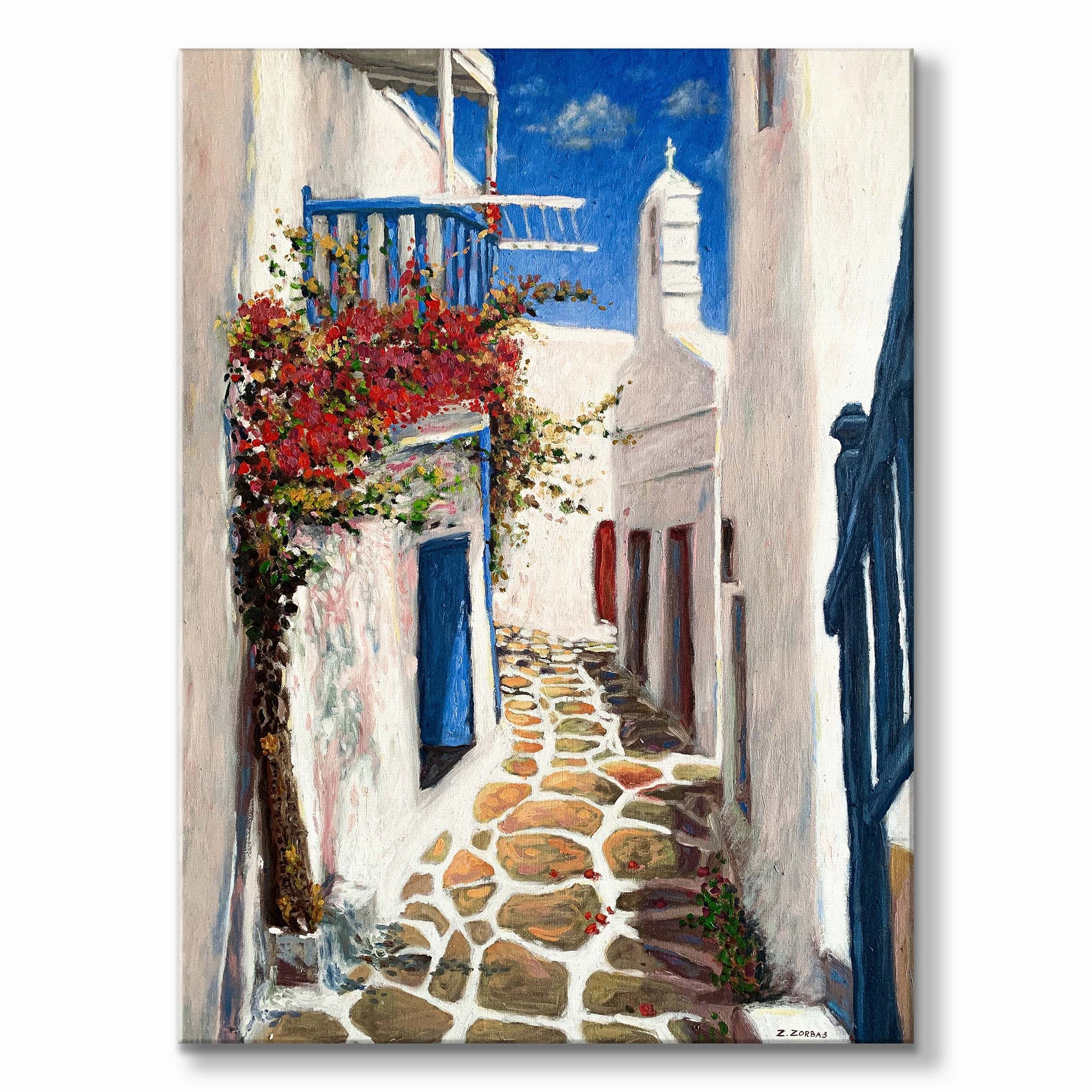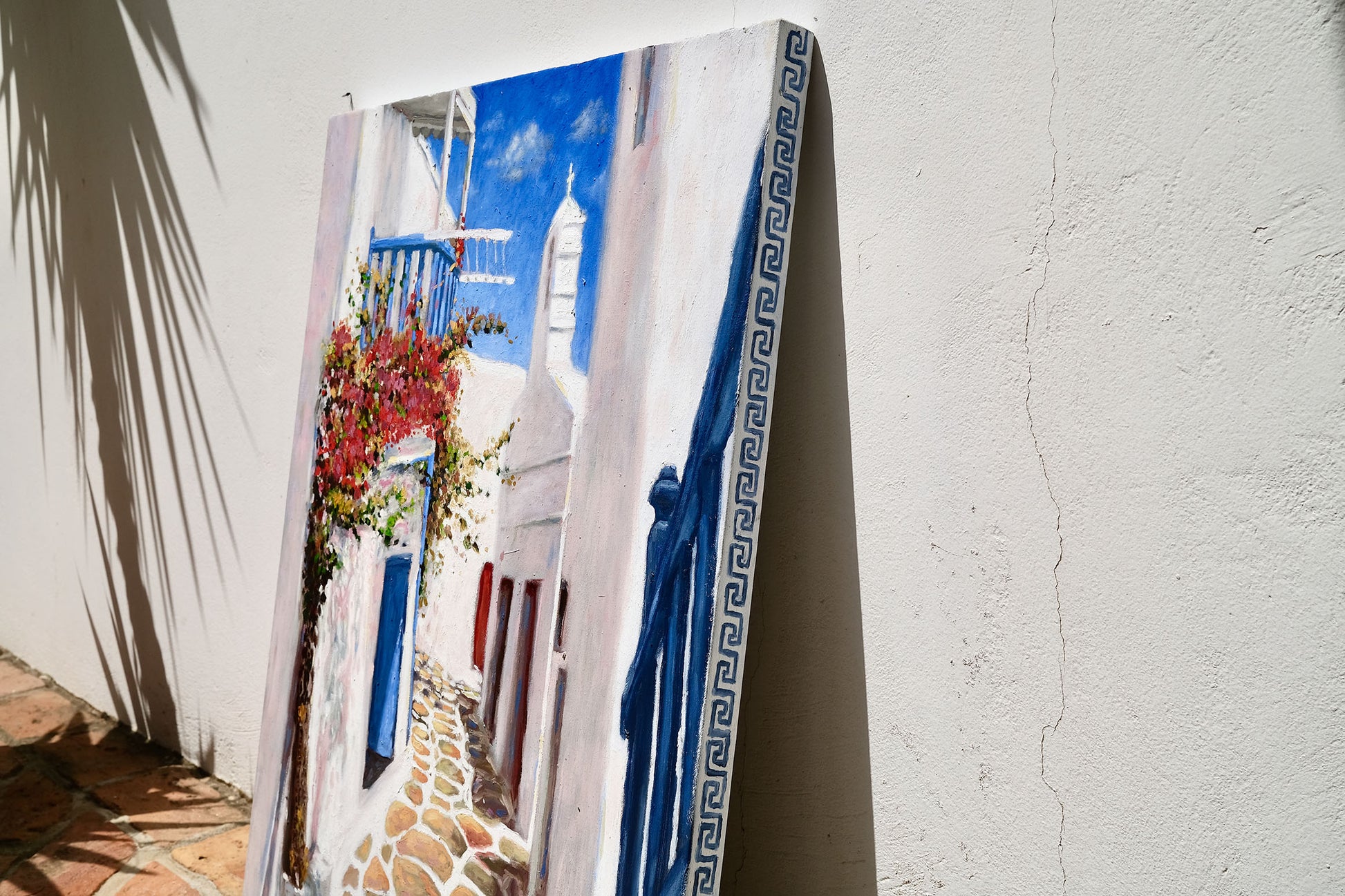 • Original painting by Zachary Zorbas titled "Mykonos Town" handmade in Aegina, Greece