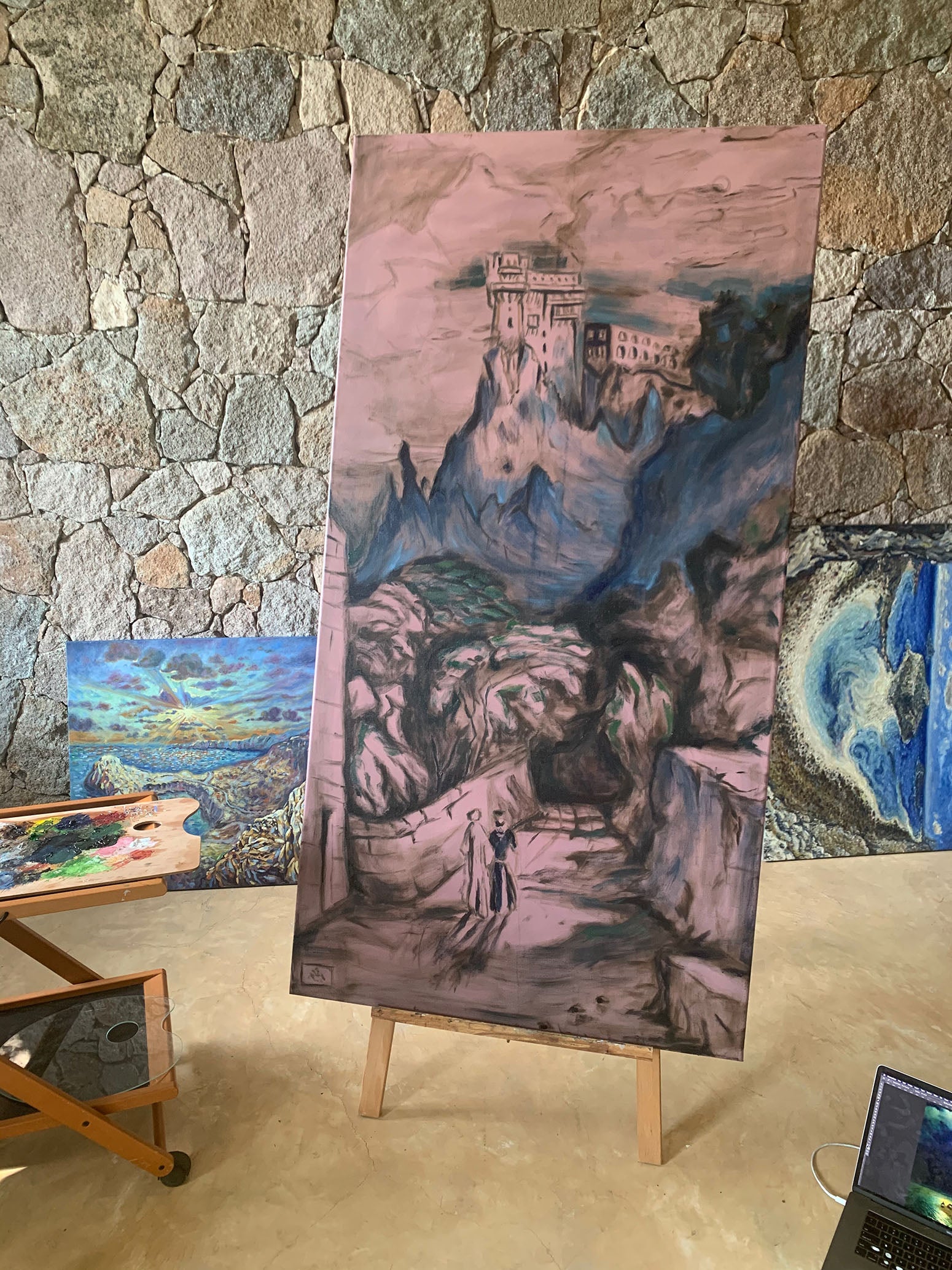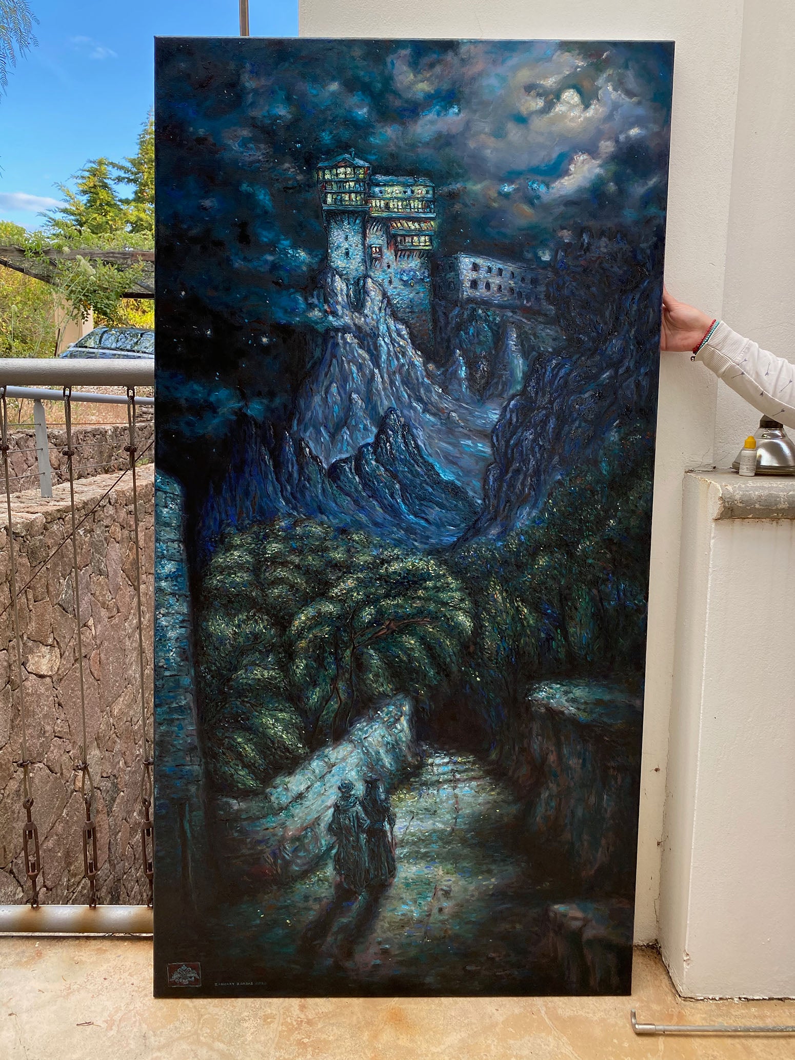 • Original painting by Zachary Zorbas titled "Finding the Monastery of Simonopetra in Mt. Athos" handmade in Aegina, Greece