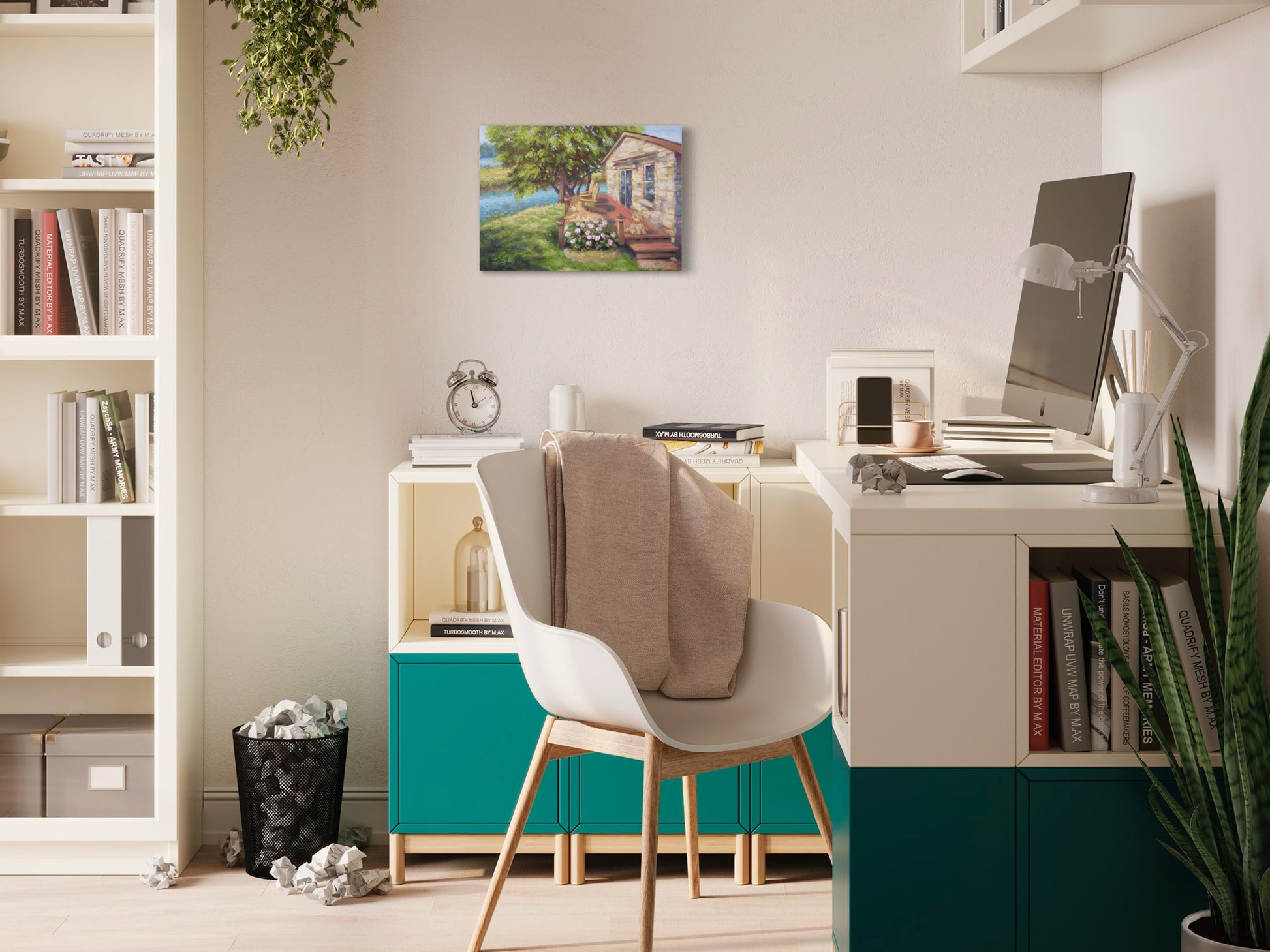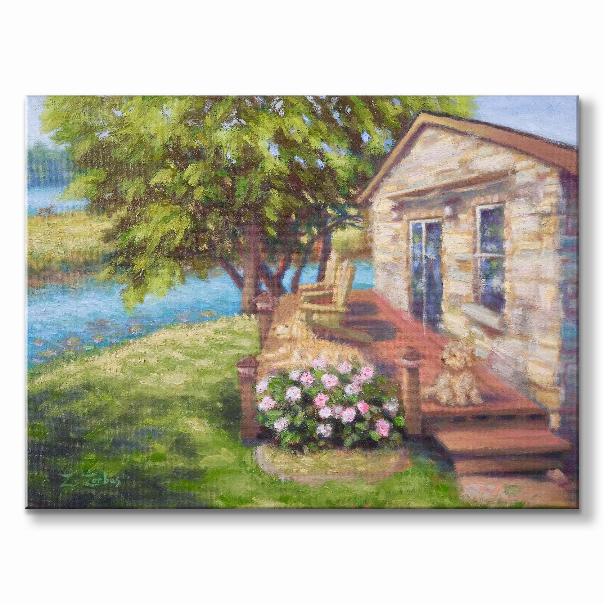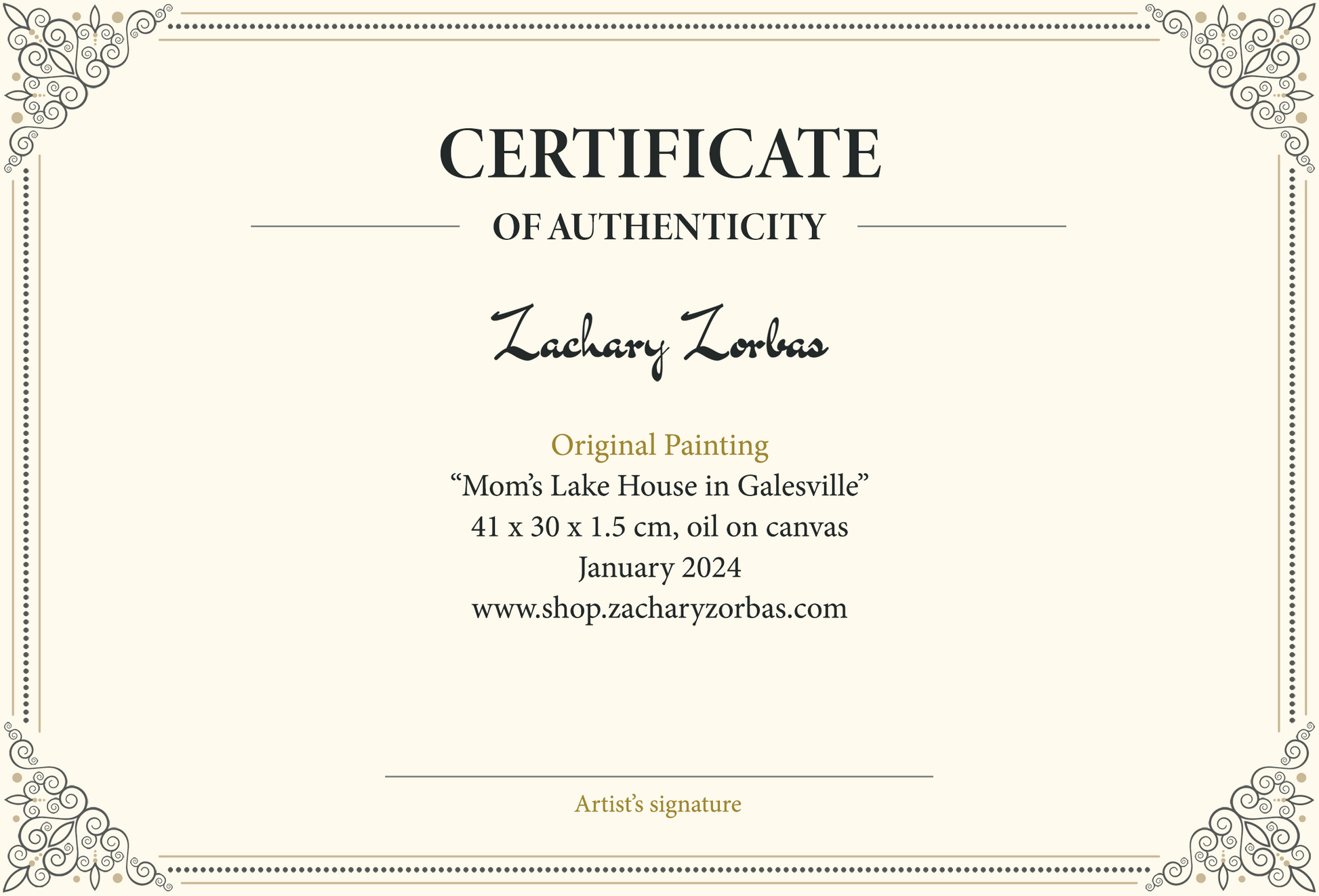 • Original painting by Zachary Zorbas titled “Mom's Lakehouse in Galesville Wisconsin” handmade in Aegina, Greece
